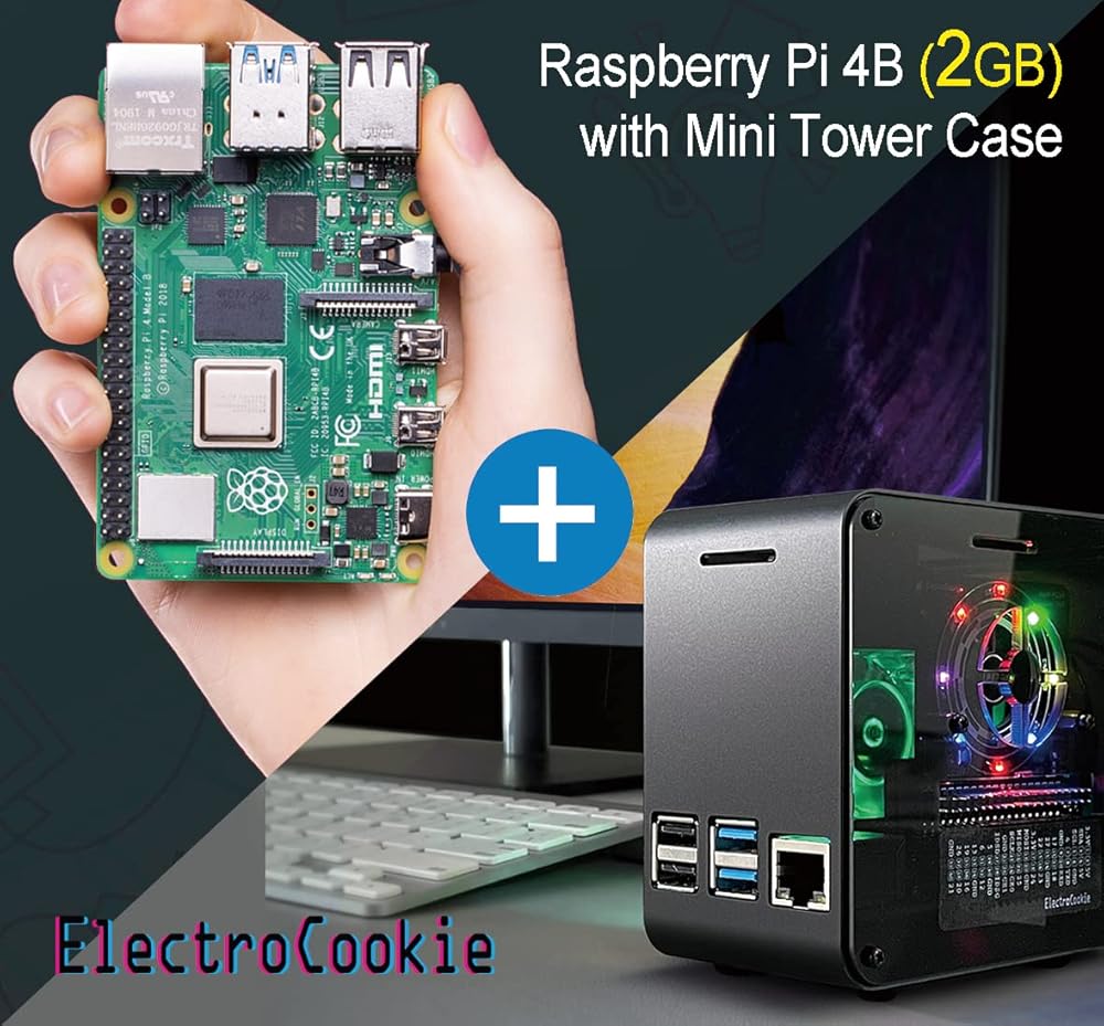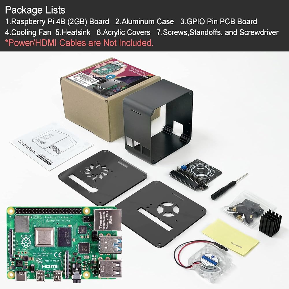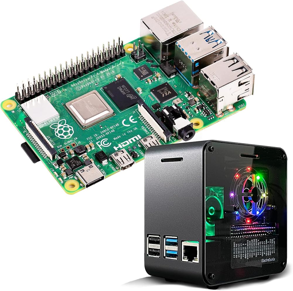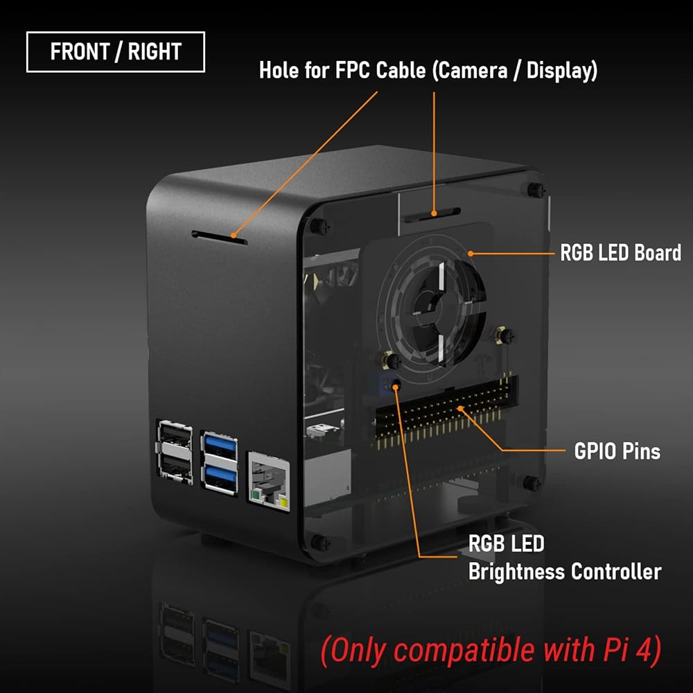 لوح راسبيري باي 4B (2GB) مع هيكل الومنيوم صغير ومروحة تبريد وضوء محيطي متغير اللون (اسود غير لامع)