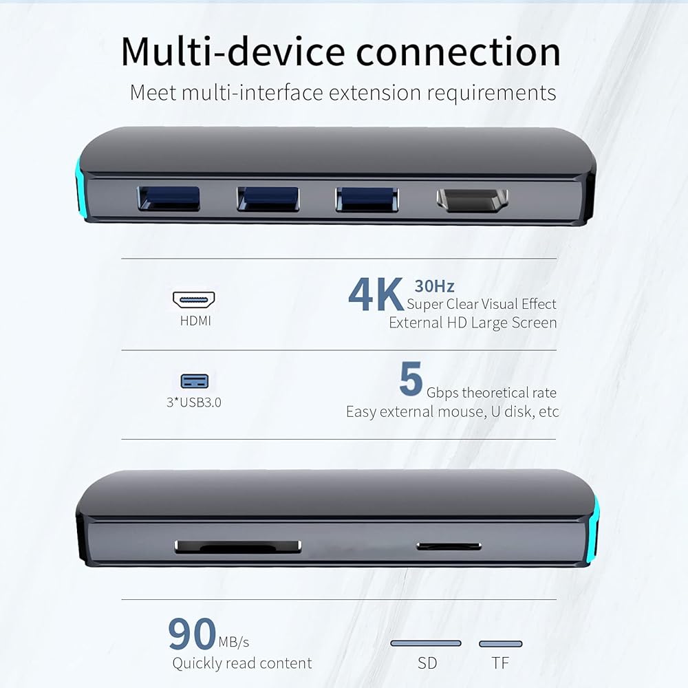 【قاعدة شحن 6 في 1 】USB 3.0 × 3 (حتى 5 جيجا بايت في الثانية) ، منفذ HDMI 4K * 1، بطاقة SD * 1، بطاقة TF * 1، مصمم خصيصًا لمعدات واجهة USB C، لا حاجة إلى أي محركات أو برنامج، فقط قم بتوصيل وتشغيل. قم بتوسيع فرص العمل الخاصة بك وتوفير أداء أكثر استقرارًا. حوّل أي كمبيوتر محمول يدعم USB C إلى محطة عمل محمولة!