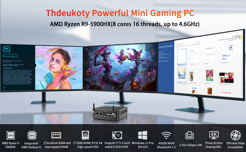 ⭐[أداء قوي] الكمبيوتر الصغير مجهز بمعالج AMD Ryzen 9 5900HX ورسومات AMD Radeon 8، 8 نواة و16 خيط، حتى 4.6 جيجا هرتز، ذاكرة تخزين مؤقت 16 ميجابايت L3. تقنية 7 نانومتر والبنية الأساسية "Zen 3". نظام التشغيل Windows 11 Pro المثبت مسبقًا (64 بت)، يدعم أيضًا نظام التشغيل Windows 10/Ubuntu/Linux. المدمج في واي فاي 6 وبلوتوث 5.1. يمكن استخدام هذا الكمبيوتر المصغر في مجالات مثل المكتب والألعاب والتصميم والترفيه المنزلي وCAD والتعلم والتعليم عبر الإنترنت والصناعة.