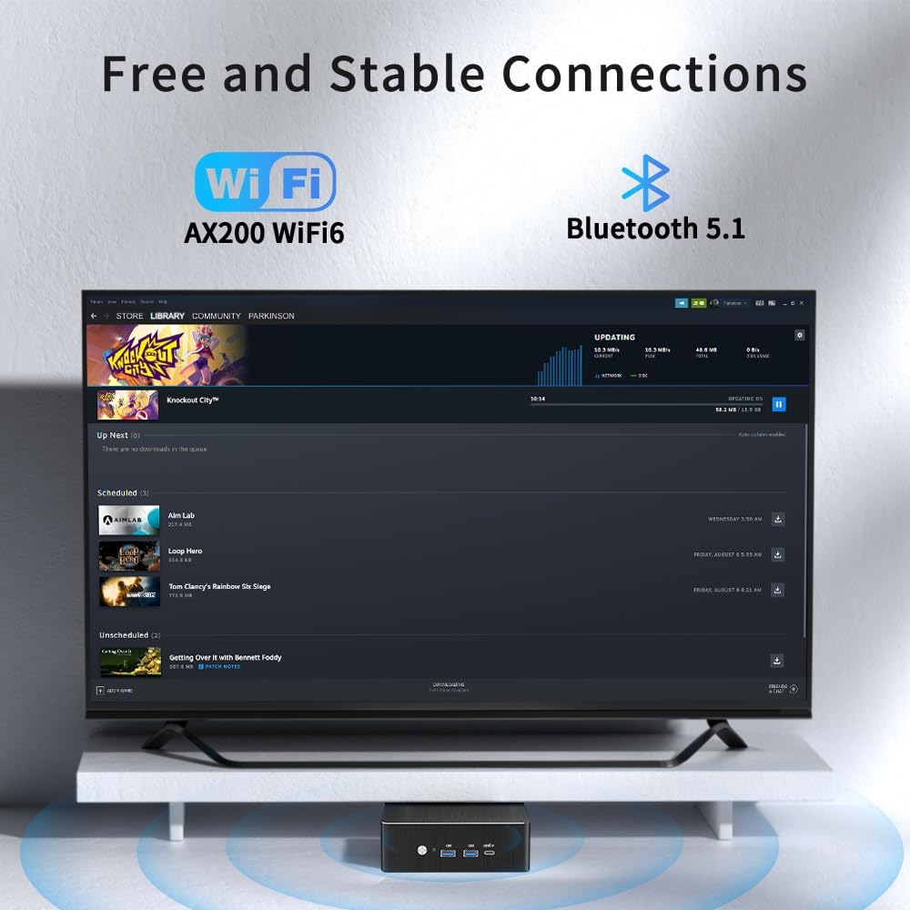 ⭐[منافذ غنية] أجهزة الكمبيوتر الصغيرة مجهزة بـ 2 * USB3.0، 4 * USB2.0، 1 * HDMI 2.0، 1 * DP1.4a، 1 * Type-C، 1 * مدخل صوت، و2.5G+1G LAN . يدعم هذا الكمبيوتر العرض متعدد الشاشات، ويعمل الهوائي الخارجي على تعزيز الإشارة من خلال صواميل التوصيل الميكانيكية. تصل السرعة القصوى لشبكة WiFi 6 إلى 9.6 جيجابت في الثانية، وهي أسرع بثلاث مرات تقريبًا من شبكة WiFi 5، مما يجعل الشبكة أكثر سلاسة. يدعم الكمبيوتر الصغير الفتح التلقائي والتنبيه عبر الإنترنت (إعدادات BIOS).