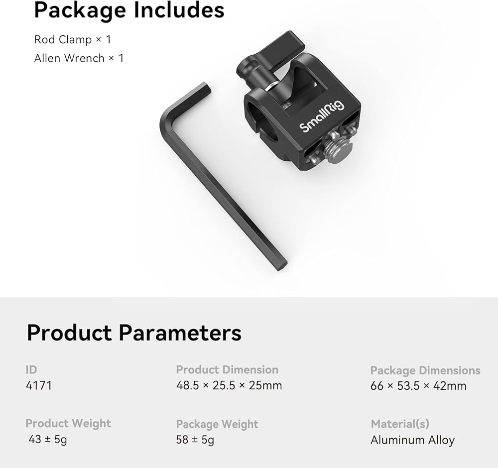تم تصميم مشبك قضيب واحد لتحديد المواقع مقاس 15 ملم من سمول ريج لـ ARRI 4171 ليتم تركيبه على المقبض والقفص واللوحة عبر برغي تحديد موقع ARRI 3/8 انش - 16 وقفل إضافي، عبر مقبض الإبهام، قضيب واحد 15 ملم لربط تركيز المتابعة والميكروفون والشاشة وما إلى ذلك.