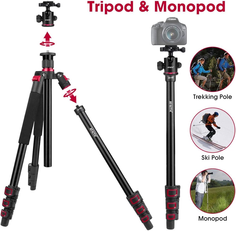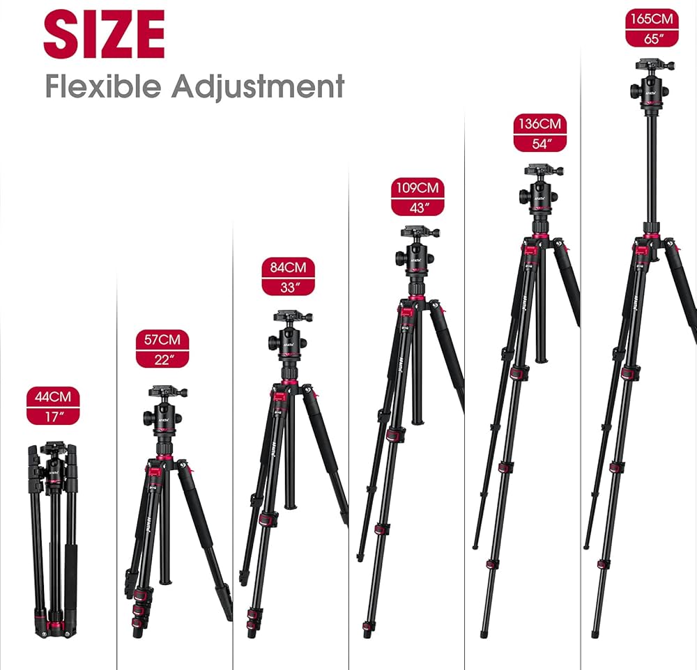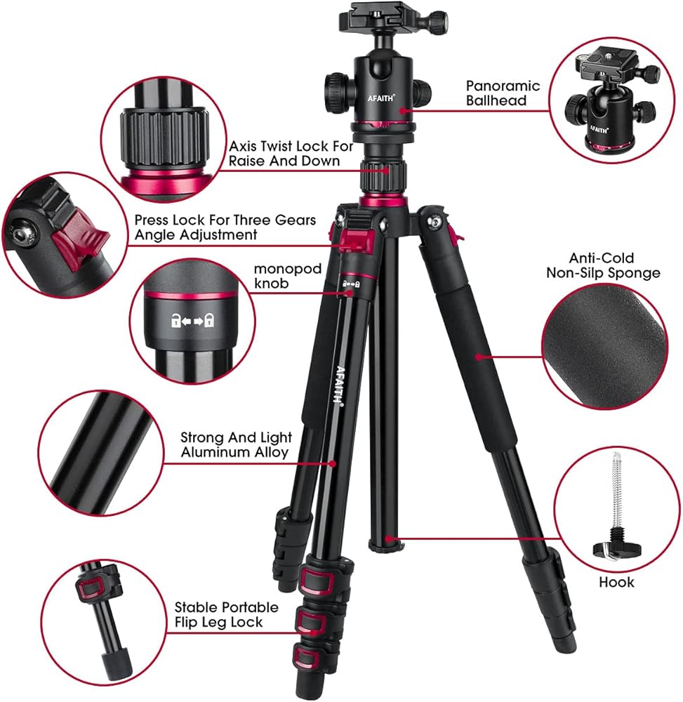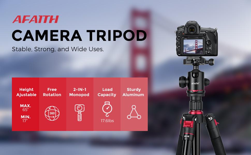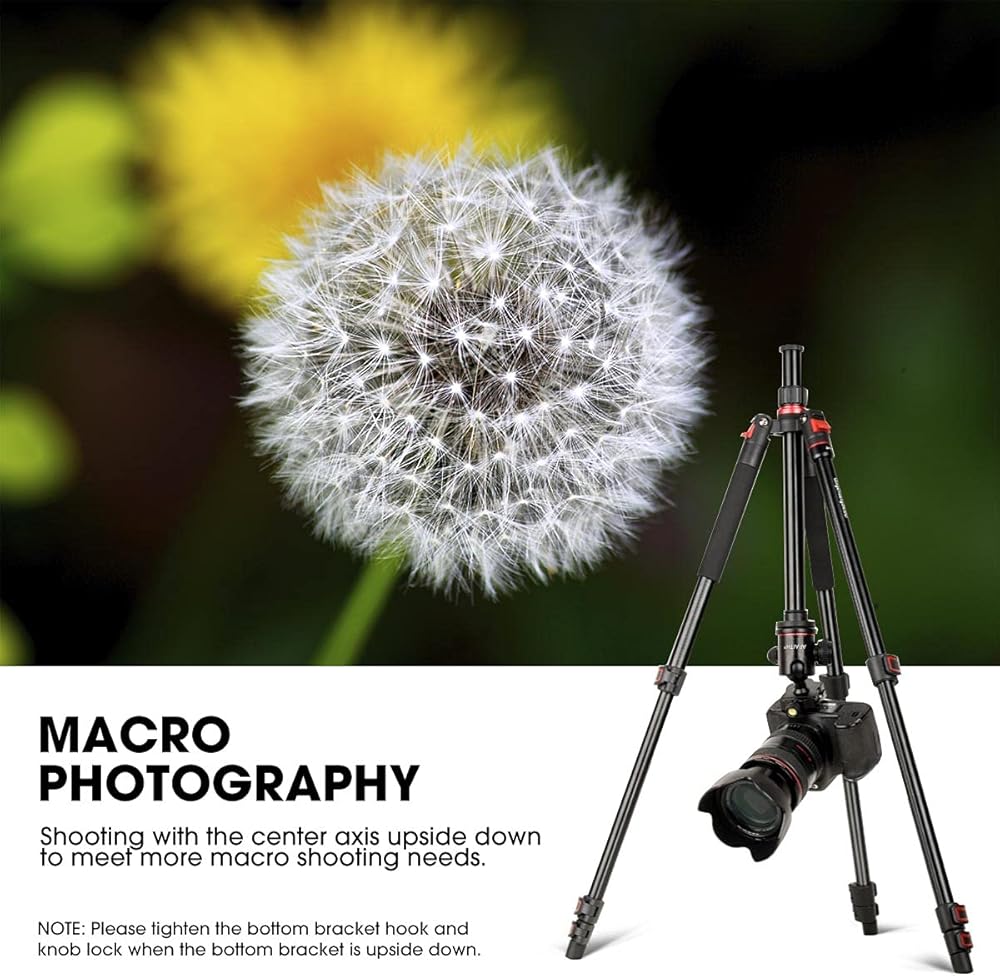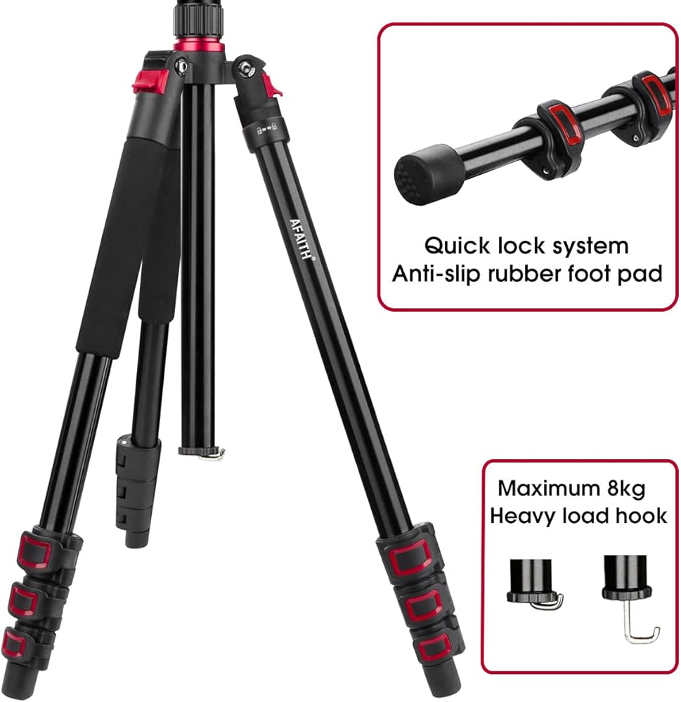 【احترافي وثابت】: حامل الكاميرا ثلاثي القوائم مصنوع من خليط معدني من الألومنيوم عالي الجودة، يصل قطر الساق إلى 23 ملم والحمل الأقصى يصل إلى 17.6 باوند/8 كغم. خطاف زنبركي موجود في الجزء السفلي من العمود المركزي يسمح لك بتعليق وزن إضافي لزيادة الثبات خاصة في الأيام العاصفة.