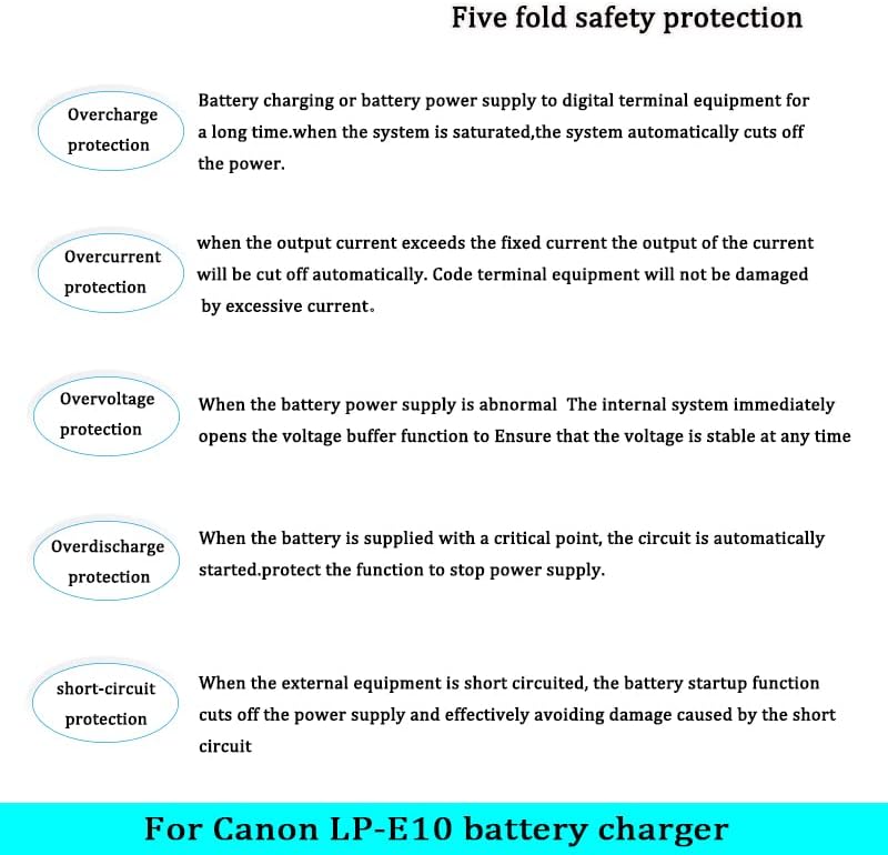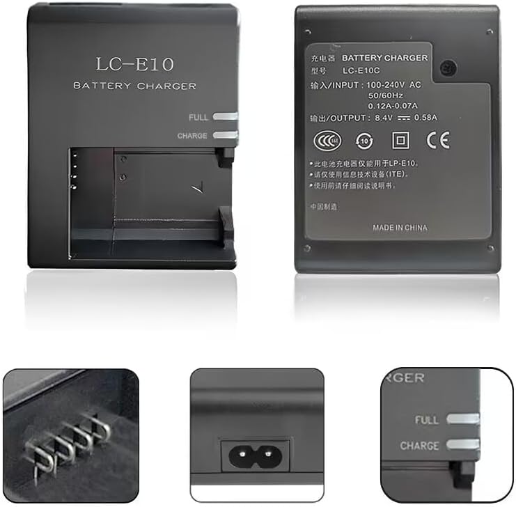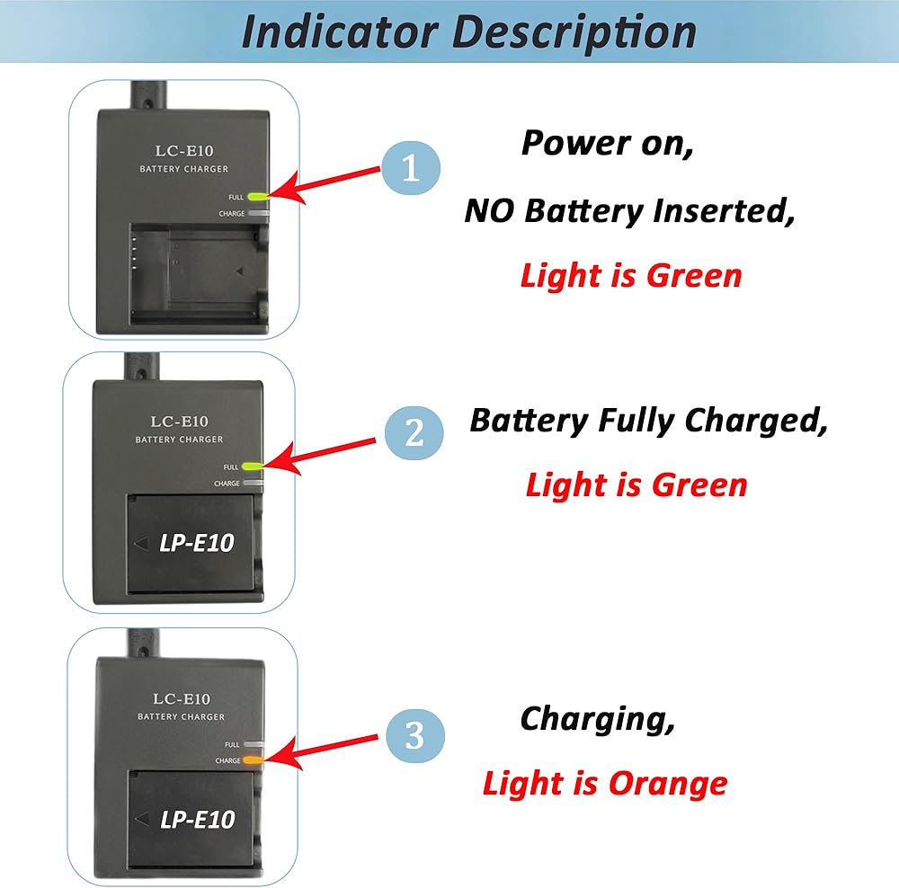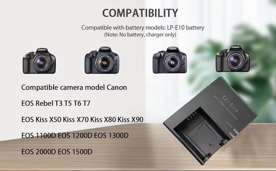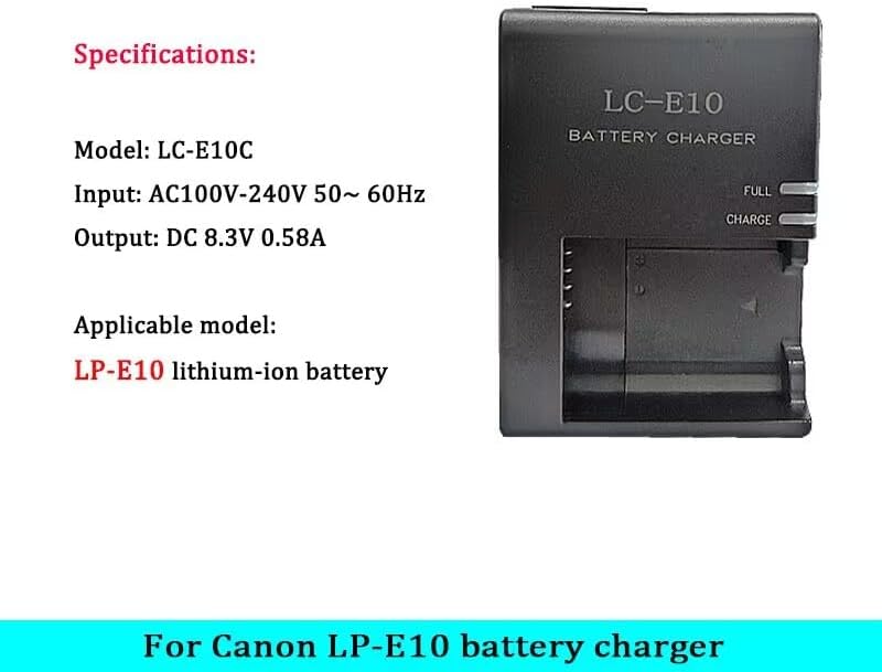 Perfect for Canon LP-E10 LC-E10 LC-E10C battery.Compatible camera models: Canon EOS Rebel T7, T6, T5, T3, T100, 4000D, 3000D, 2000D, 1500D, 1300D, 1200D, 1100D, Kiss X50 X70 X80 X90 (Not For T3i T5i T6i T6s T7i)