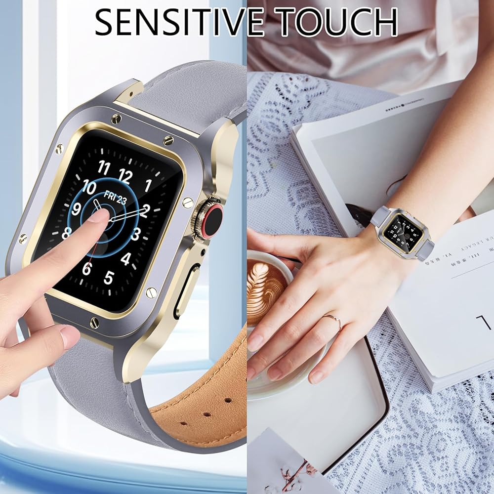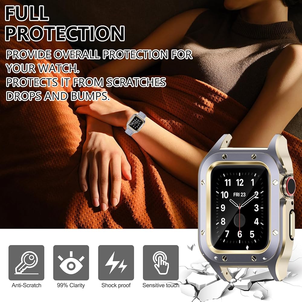 【الحماية الشاملة】: مصنوعة من مصد البولي كربونات الصلب وواقي شاشة زجاجي مقوى عالي الشفافية، مما يوفر حماية كاملة 360 درجة لساعتك الذكية من الخدوش والصدمات والسقوط العرضي. العري. حساسة لمس المشاعر.
