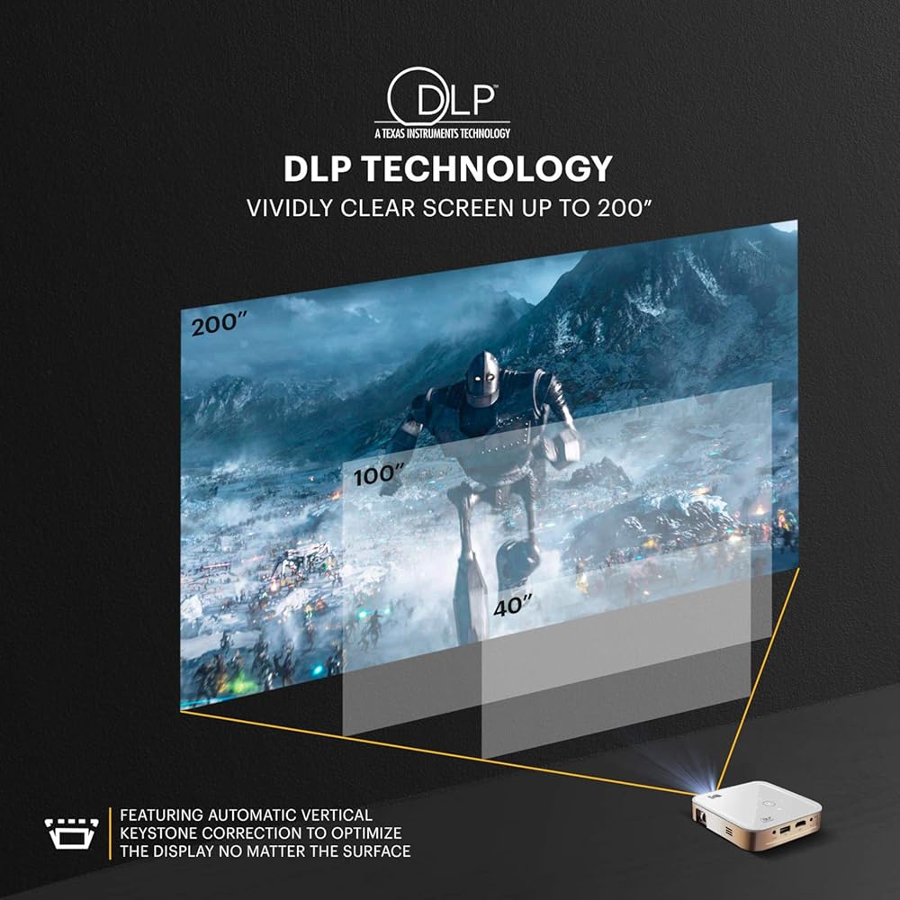 الخيار الأول لعرض دي ال بي، يستخدم جهاز العرض الذكي المحمول تقنية معالجة الضوء الرقمية المتقدمة لتقديم ما يصل إلى 4 كيه فيديو وتصوير مع لون مذهل ووضوح وسطوع 150 لومن ايه ان اس اي، شاشات ضخمة تصل إلى 200