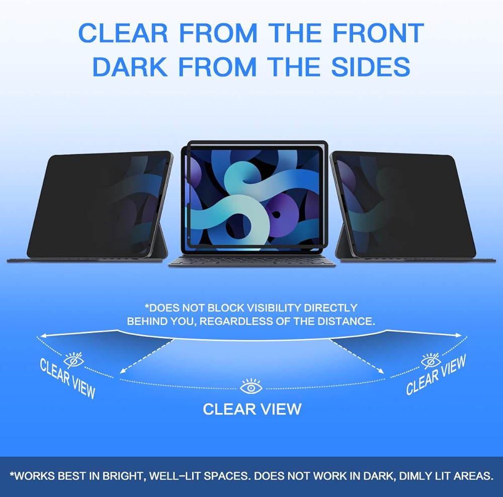 • الزاوية المرئية لمرشح شاشة الخصوصية: +/- 30 درجة، تكون مرئية فقط للأشخاص الموجودين أمام الشاشة، بينما الحياة للآخرين ليست سوى شاشة سوداء. أينما كنت، سيحمي مرشح الخصوصية المغناطيسي أي معلومات حساسة متسربة، ويمكن لواقي شاشة الخصوصية لجهاز iPad Air 3 أن يمنع المتسللين بشكل فعال من مراقبة أفعالك من خلال كاميرا الويب لحماية خصوصيتك بشكل فعال.