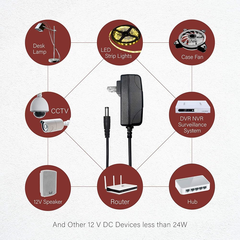 【Application】 (Should be 12 V & not exceed 24 W) : Security CCTV Camera / LED Strip Lights / Cable Modem / Router / Hub / Battery Charger / IR Illuminator/ Foot Back Neck Shoulder Massager / Electronic Piano Keyboard / DVR NVR Surveillance System / Portable Radio / Computer PC Case Fan / Motor/ Computer Speakers / External Hard Drive / And Other 12 V DC Devices less than 24W.