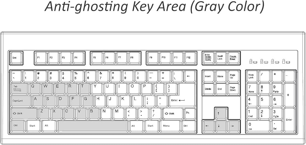 - منطقة مفاتيح الاستجابة لضربات مفاتيح متعددة: كويرت، قفل كابسلوك، ايه اس دي اف جي، يسار شيفت، زد اكس سي في بي، يسار كترل، شريط مسافة و4 مفاتيح أسهم