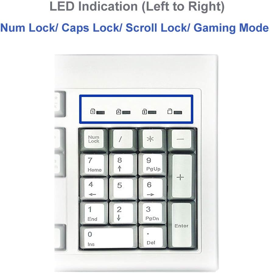 - مؤشر LED: قفل الأرقام، قفل الغطاء، قفل التمرير، ووضع الألعاب (LED أحمر)