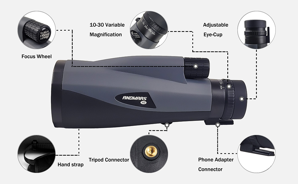 تكبير متغير 10-30: تكبير متغير 10-30 يسمح لك برؤية المزيد من التفاصيل للعرض عن بعد أو التصوير الفوتوغرافي.