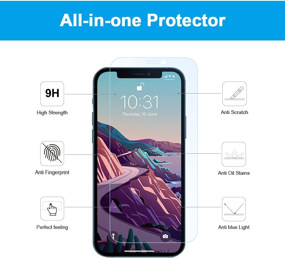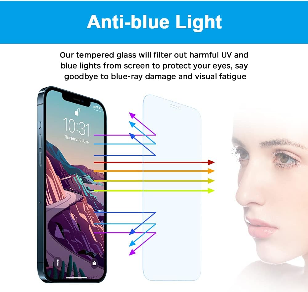 ترشيح الضوء الأزرق: يتميز بتقنية ترشيح الضوء الأزرق، مما يزيل الضوء الأزرق لشاشة هاتفك للمساعدة في إراحة عينيك من الإجهاد والتعب. يحافظ على صحة عينيك من التحديق على الشاشة لفترات طويلة من الوقت.