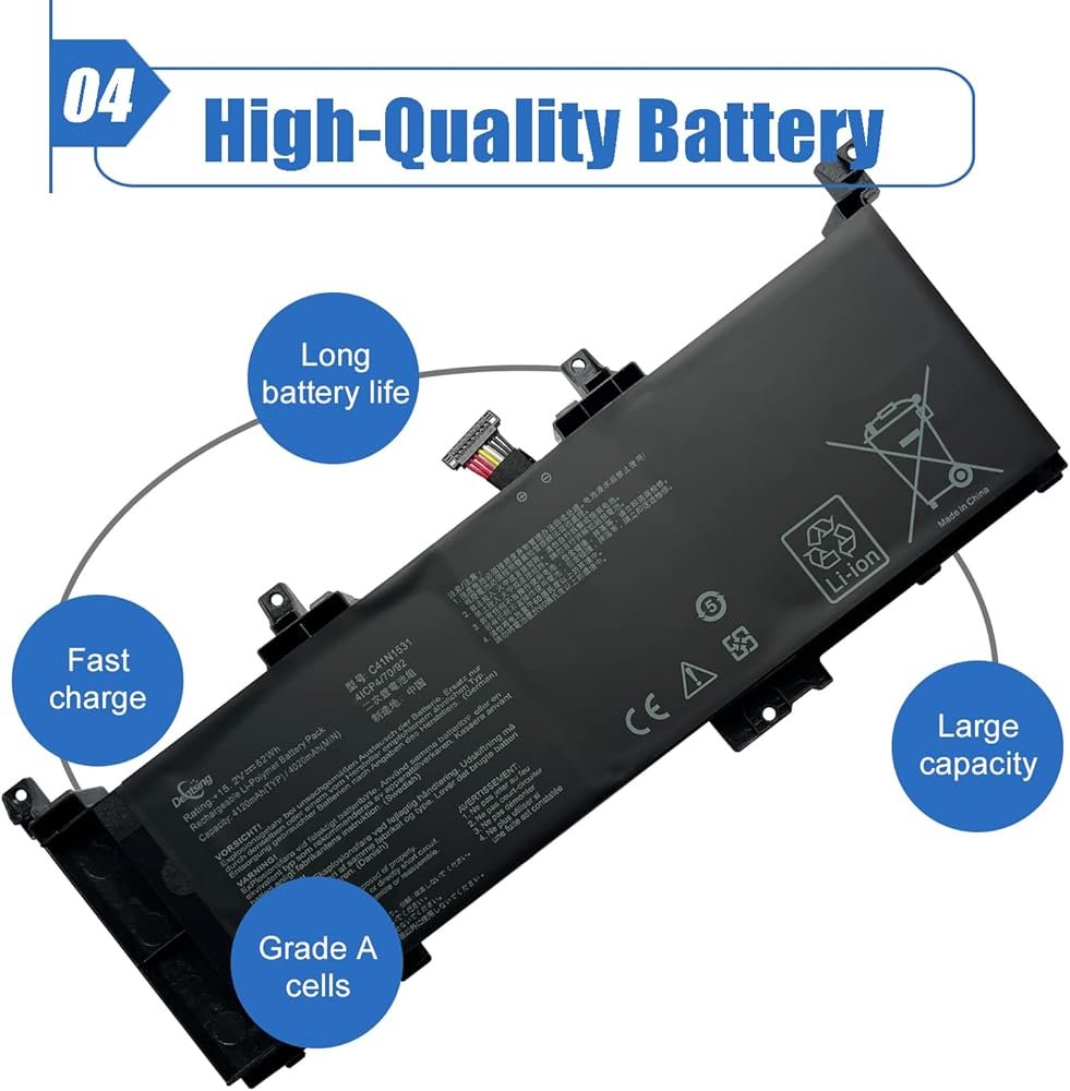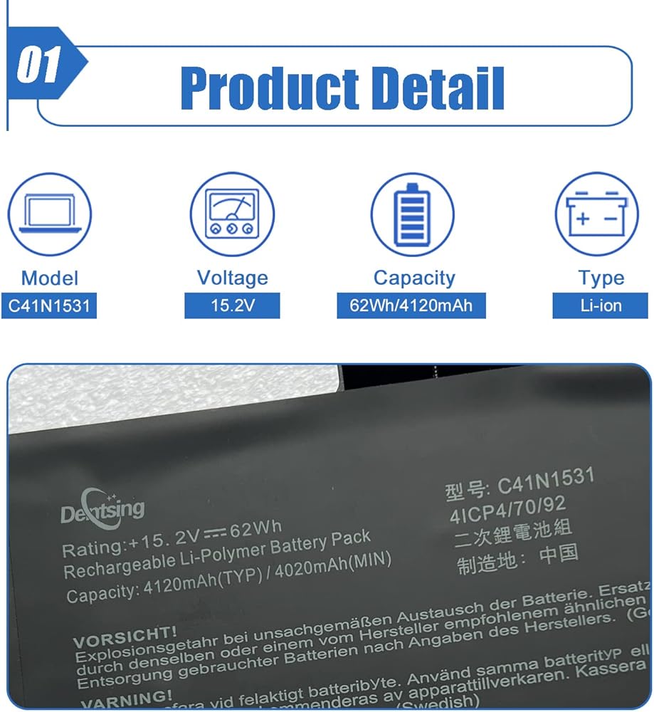 • 【التفاصيل الأساسية】نموذج المنتج: C41N1531؛ نوع البطارية: ليثيوم أيون؛ الجهد: 15.2 فولت؛ السعة: 62 وات/4120 مللي أمبير/ساعة 4 خلايا؛ لون البطارية: أسود.