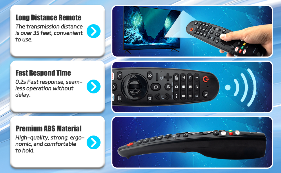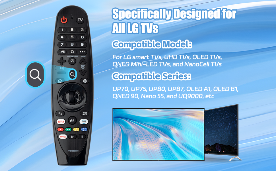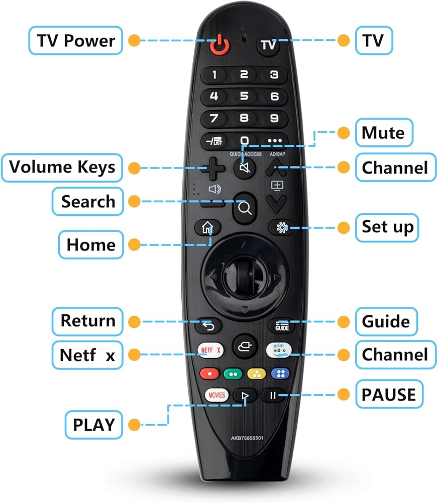 توافق عالمي: جهاز التحكم عن بعد الخاص بالتلفزيون هذا متوافق مع جهاز التحكم عن بعد الخاص بالتلفزيون LGLG السحري، بما يتوافق مع مجموعة واسعة من الموديلات، بما في ذلك AN-MR19BA، وAN-MR600G، وAN-MR650، وغيرها الكثير، مما يضمن ملاءمة مثالية للتلفزيون الخاص بك.