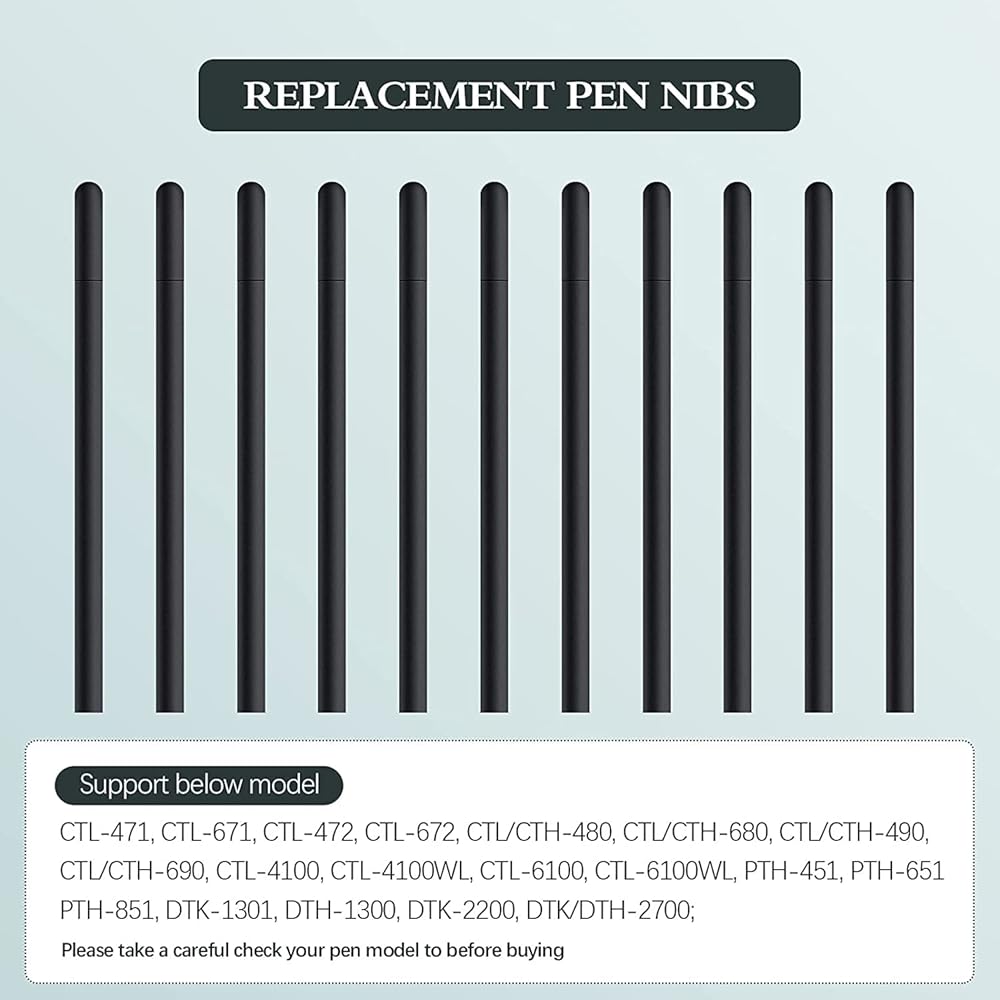 توافق المنتج: تم تصميم سنان الأقلام الرقمية البديلة هذه للعديد من النماذج الرقمية، وهي متوافقة مع أقلام Wacom Bamboo Intuos، مثل CTL-471، CTL-671، CTL-472، CTL-672، CTL/CTH-480، CTL/CTH- 680، CTL/CTH-490، CTL/CTH-690، TCTL-4100، CTL-4100WL، CTL-6100، TL-6100WL، PTH-451، PTH-651، PTH-851، DTK-1301، DTH-1300، دتك-2200، دتك/دث-2700؛ يرجى التحقق بعناية من طراز القلم الخاص بك قبل الشراء.