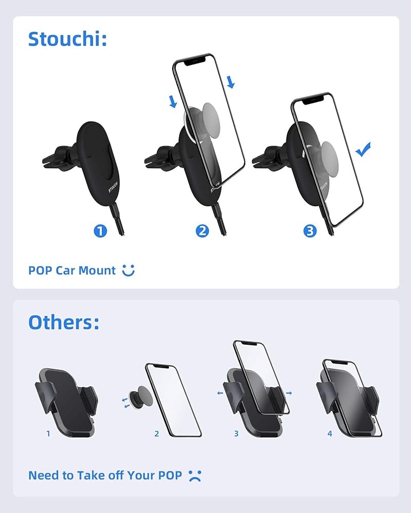 【تصميم 2 في 1: حامل سيارة بوب وشاحن سيارة لاسلكي】يجمع حامل السيارة اللاسلكي من ستوشي بوب بين حامل بوب للسيارة والشاحن اللاسلكي كيو اي مع دوران 360 درجة. لا يحمل هاتفك فحسب، بل يشحن هاتفك لاسلكيًا. (يناسب معظم أجزاء البوب باستثناء سمك القاعدة التي تزيد عن 3 ملم)
