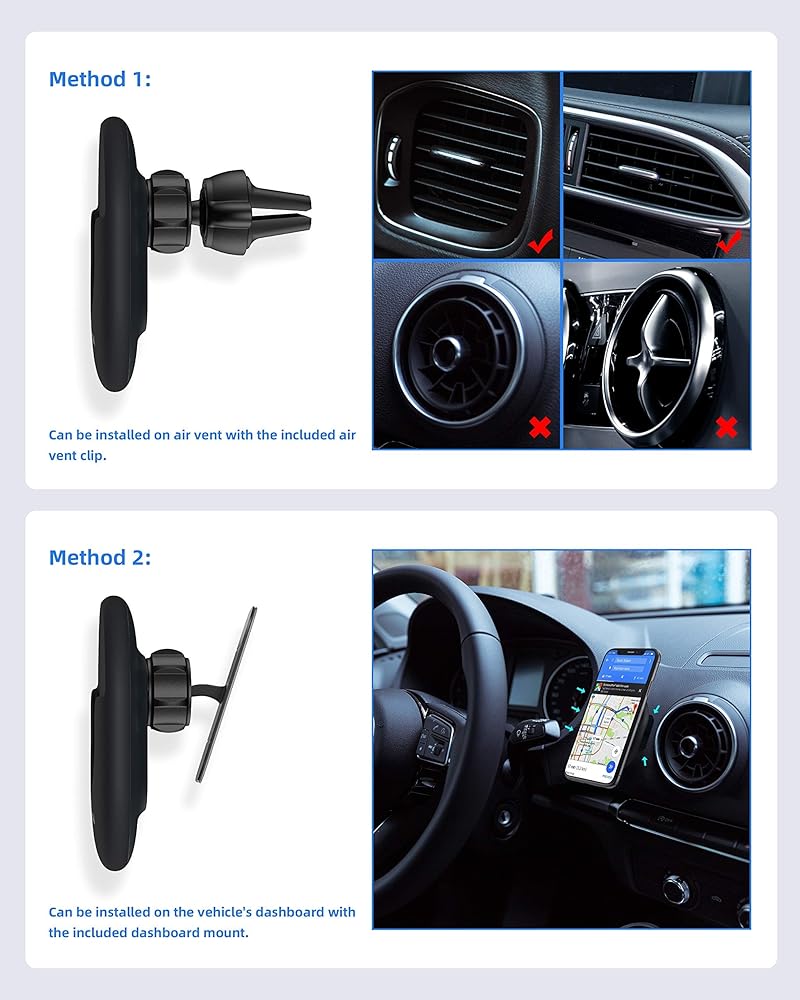 【يمكن التحكم فيه بيد واحدة - التوصيل والتشغيل】يتميز حامل شاحن السيارة اللاسلكي من ستوشي بوب بتصميم يمكن التحكم فيه بيد واحدة، ثم قم بتثبيته في ثوانٍ فقط بضغطة واحدة، وقم بتوصيل أو فصل جهازك المحمول بسلاسة بسهولة. يمكن تركيبه على لوحة القيادة أو فتحة التهوية، مع حامل لوحة القيادة ومشبك فتحة الهواء. (حامل لوحة القيادة مع جل لاصق ومثبت مضاد للاهتزاز يحافظ على التثبيت بأمان دون اهتزاز)