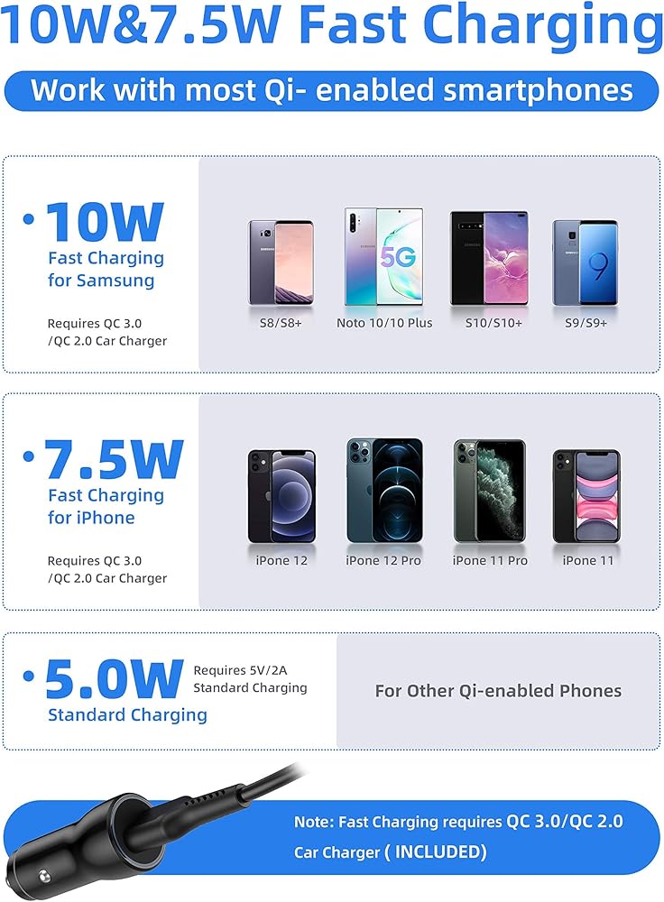 【الحد الأقصى من التوافق】10 واط لهاتف سامسونج جالكسي اس 20/ اس 20 بلس/ سامسونج نوت 10/ نوت 10 بلس/ اس 10/ اس 9/ اس 8/ اس 7/ اس 6 ايدج +/نوت 5؛ ماكس 7.5 واط لهواتف ايفون 12/ ميني/ 11 برو/ برو ماكس/ اكس اس/ اكس ار/ 8/ 8/ 8/ ايفون سي؛ 5 واط للهواتف الأخرى التي تدعم تقنية كيو اي. بالنسبة إلى وضع الشحن السريع 10 وات، 7.5 وات، يلزم محول شاحن السيارة كيو سي 3.0 كمصدر طاقة (مزود).