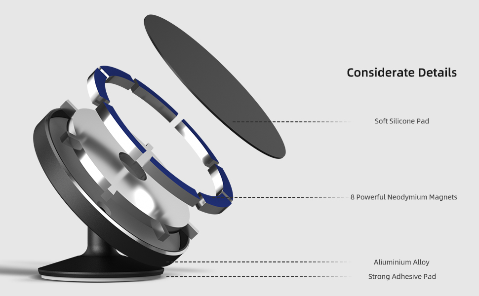 • مواد فاخرة مصنوعة من خليط الألومنيوم والسيليكون الناعم، يتميز حامل السيارة المغناطيسي بسطح أملس ولمسة ناعمة ومتينة. مفصل كروي معدني صلب، زاوية قابلة للدوران 360 درجة لجهاز ايفون الخاص بك
