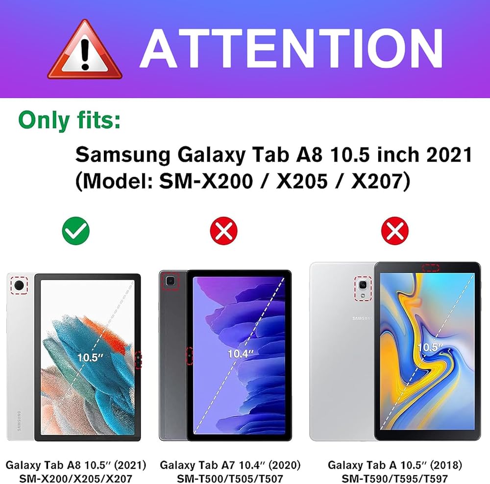 التوافق: مصمم خصيصًا لجهاز Samsung Galaxy Tab A8 10.5 بوصة 2022 (SM-X200، SM-X205، SM-X207). لا تناسب أي نماذج أخرى. يرجى التحقق من الجزء السفلي من جهازك اللوحي للعثور على رقم الطراز.