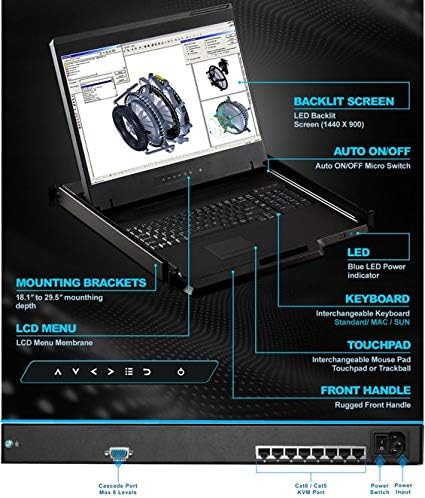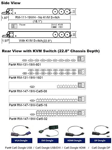 Crystal Image Technologies - شاشة 1U مقاس 19 بوصة مثبتة على حامل مع 8 منافذ Cat5 KVM Switch، 1440 X 900، تم طلب دونجل Cat5 بشكل منفصل، الجزء # RM-147-19W-Cat5-08، ضمان لمدة 3 سنوات