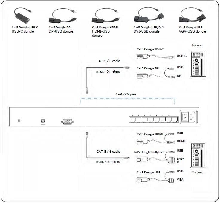 المميزات - محول 8 منافذ Cat5/Cat6 KVM مدمج في درج وحدة التحكم 1U Rackmount (دقة 1440 × 900)