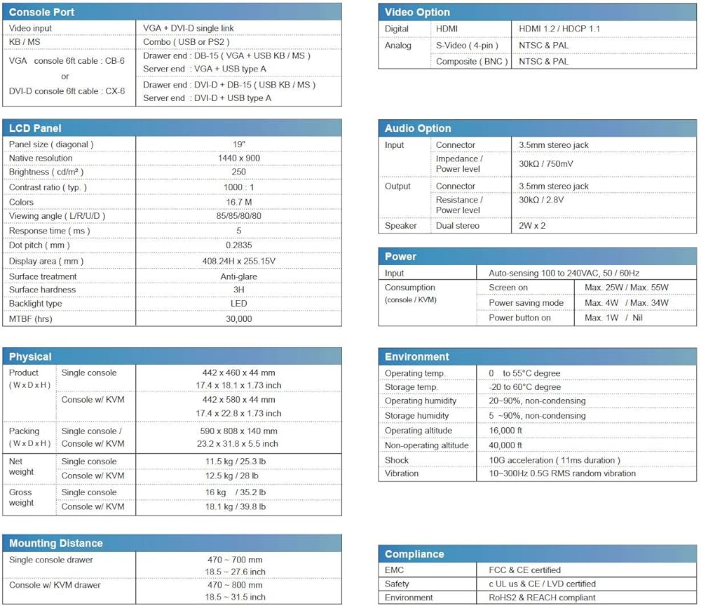 شاشة 1U مقاس 19 بوصة مثبتة على حامل مع 8 منافذ Cat5 KVM Switch. يشتمل درج KVM على 8 منافذ RJ45 لقبول كابلات Cat5e أو Cat6. حدد Cat5/Cat6 Dongles للاتصال بجهاز الكمبيوتر الخاص بك، أو الخادم باستخدام خيارات إدخال دونجل Cat5 KVM - VGA وDVI وHDMI وDP وUSB-C يبلغ عمق الهيكل الصناعي المتين 22.8 بوصة مع نطاق تثبيت من 22.8 بوصة إلى 31 بوصة. فيديو - دقة تبلغ 1440 × 900 مع لوحة مفاتيح للكمبيوتر المحمول مكونة من 104 مفاتيح مع ماوس لوحة اللمس. يسمح التصميم المعياري بتبديل كرة التتبع - وتغييرها بسهولة في الميدان. تم تصميم دعامات التثبيت لتركيب شخص واحد، نطاق التركيب - من 22.8 بوصة إلى 31 بوصة، هيكل درج وحدة تحكم LCD من الفولاذ الصلب المثبت على حامل، يتضمن ضمان لمدة 3 سنوات (القطع والعمالة) شاشة LCD مثبتة على حامل - تقنية الإضاءة الخلفية LED مقاس 19 بوصة، معالجة سطحية مضادة للوهج ، صلابة السطح 3H، 16.7 مليون لون، نسبة تباين 1000:1، وقت استجابة 5 مللي ثانية، زاوية عرض 85/85/80/80 (L/R/U/D) الشركة - تصنيف BBB A+، بيع أكثر من 5000 شاشة / الامتثال - متوافق مع cUL وCE وFCC وLVD وRoHS2 وREACH وTAA،