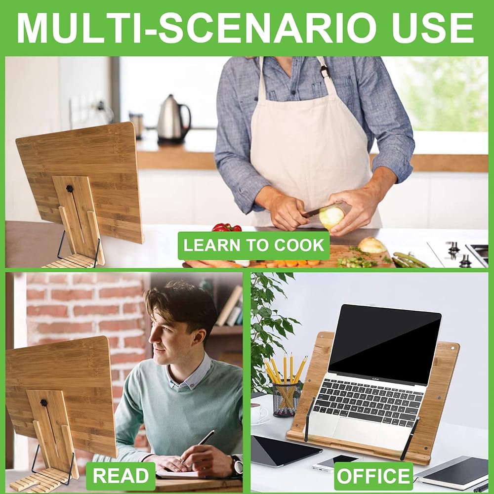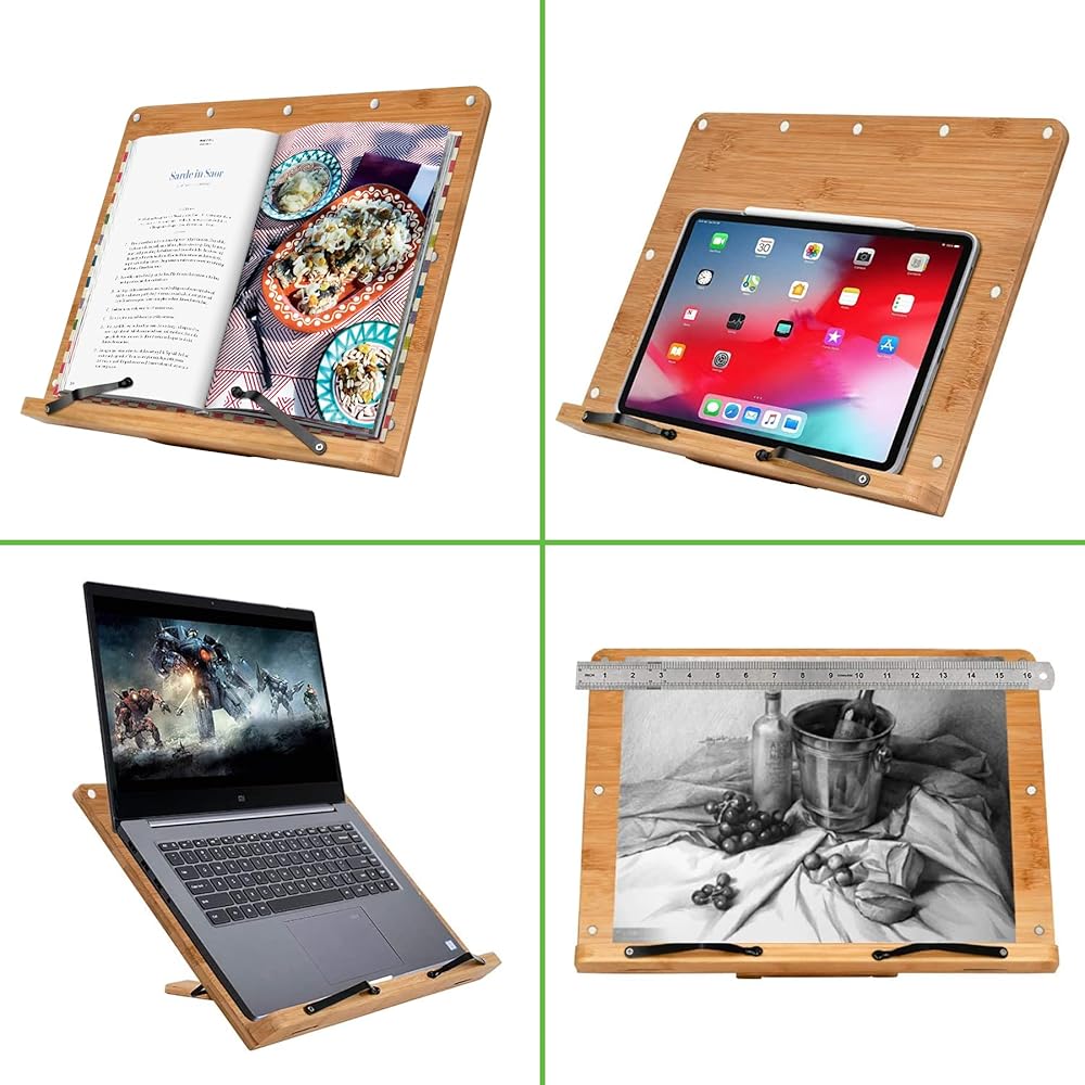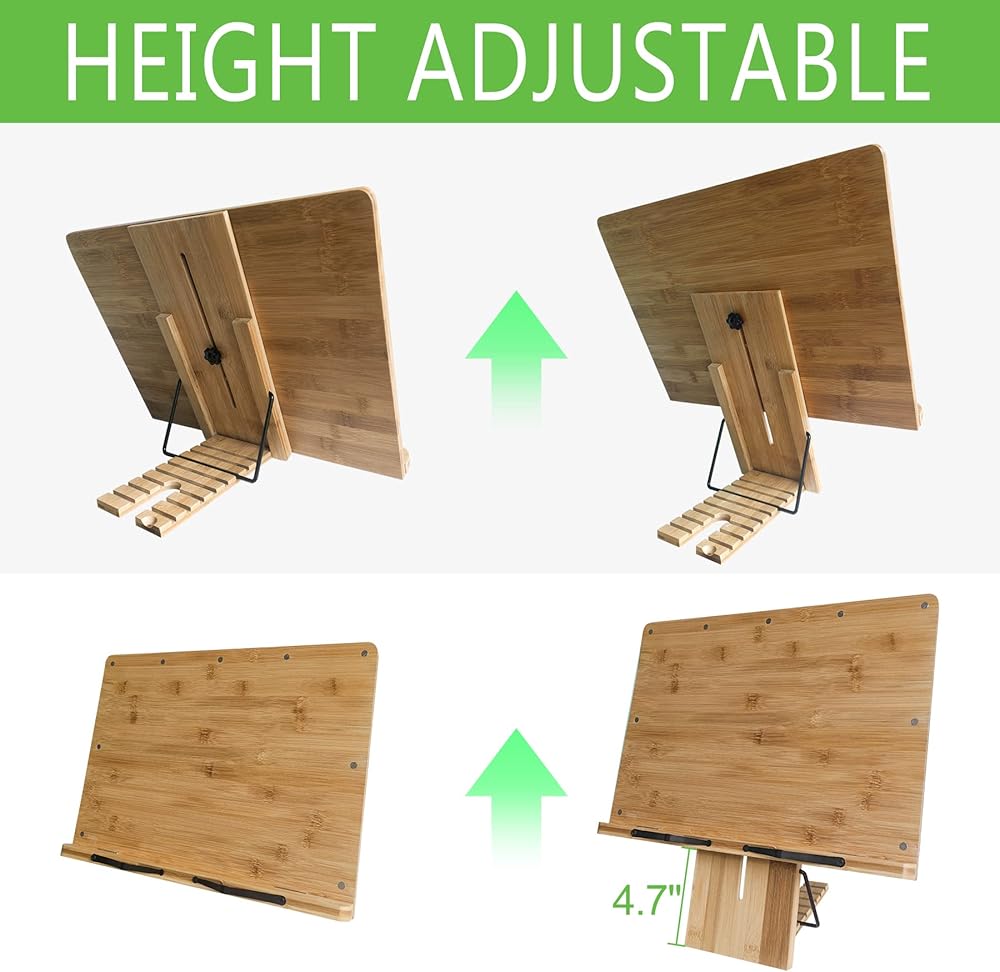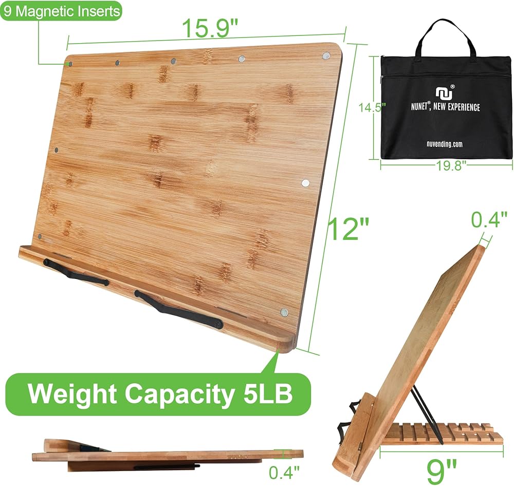 • 【كبير جدًا وقابل للطي】يمكن لمشبكين من الصفحات المعدنية حمل أوراق الموسيقى الكبيرة أو كتب الطبخ السميكة ويجعلك حرًا في يدك. يمكن ضبط الرف الخلفي لحامل الخيزران على 8 زوايا. قم بفك المسمار الخلفي لضبط ارتفاع الحامل عمل الفنان أو المكتب المنزلي. نطاق الارتفاع القابل للتعديل هو 4.7 بوصة.
