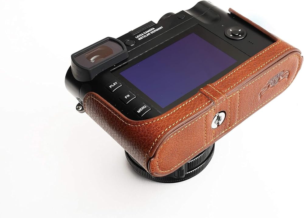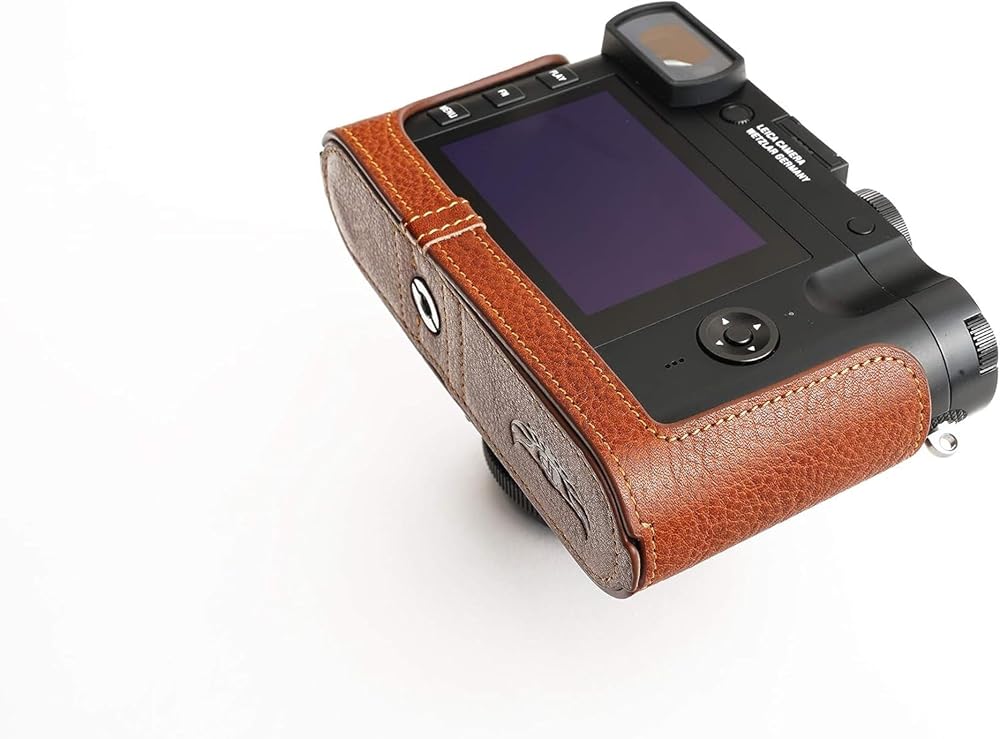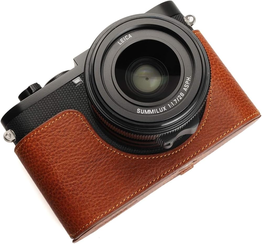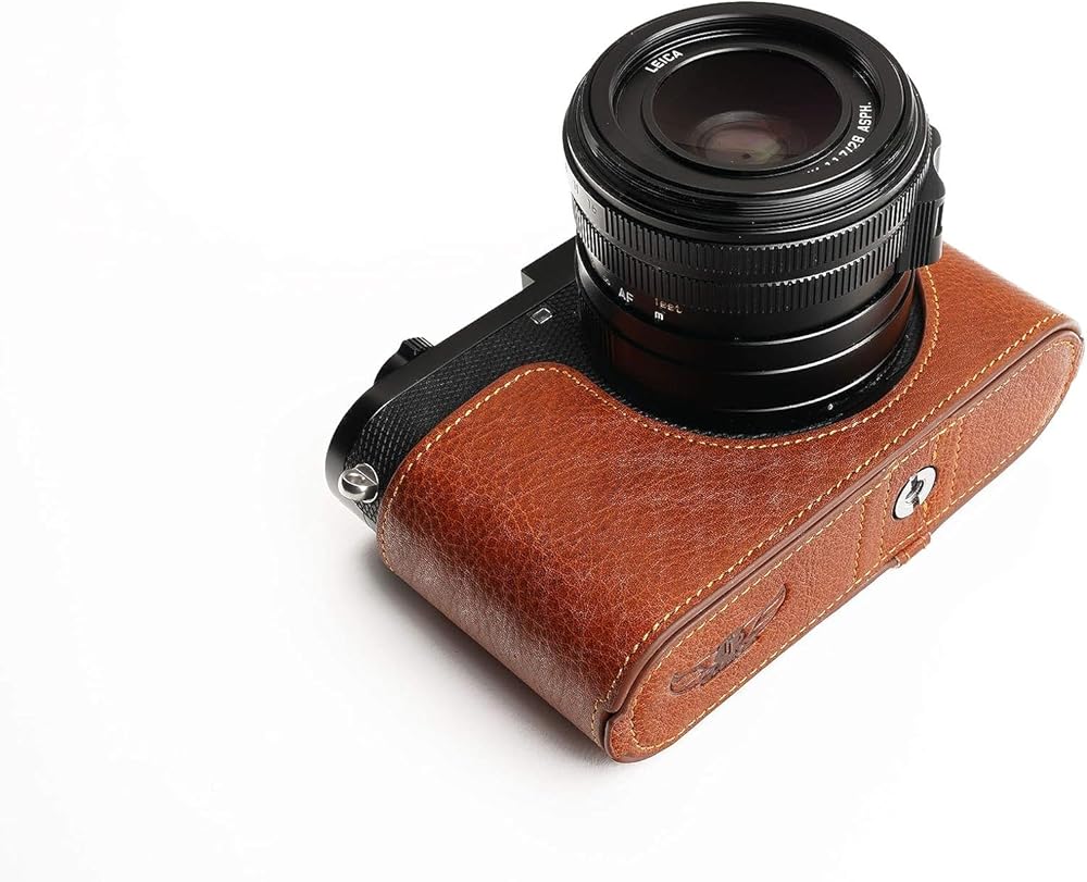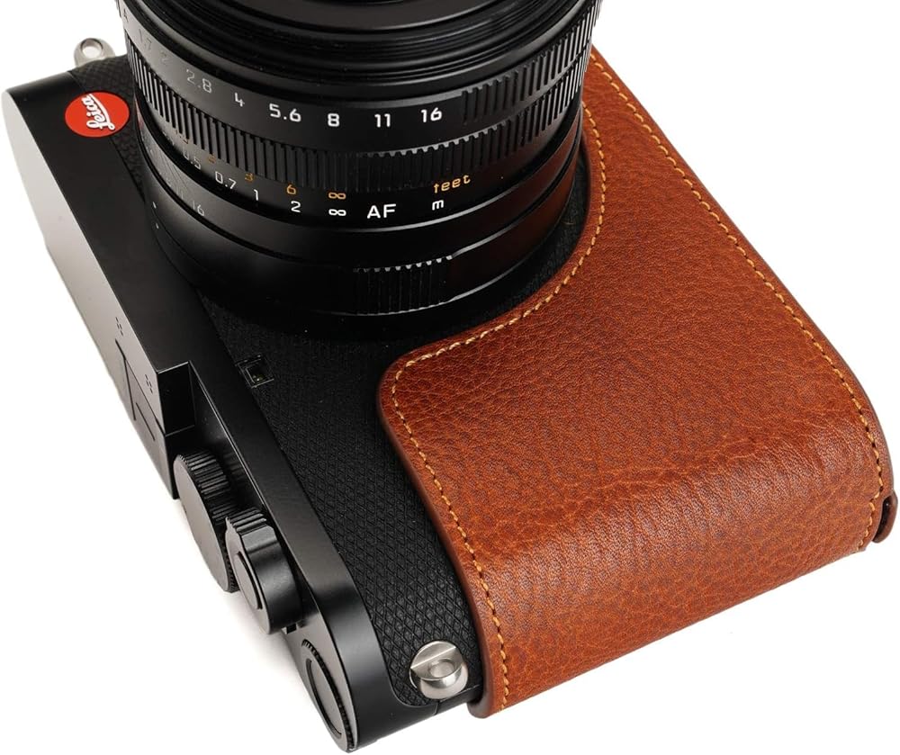 هذه الكاميرا مصنوعة من طبقة علوية من الجلد الزيتي الحقيقي، والتصميم بسيط وعتيق، واستخدام تقنيات المقاسات المعدنية يجعلها مناسبة جدًا لجسم الكاميرا.