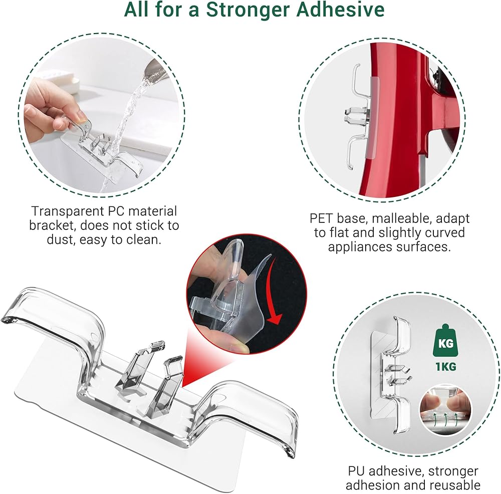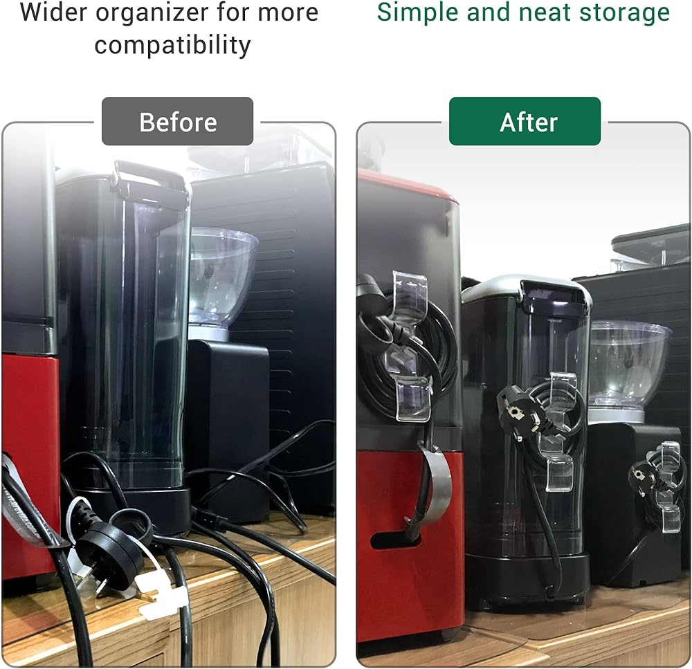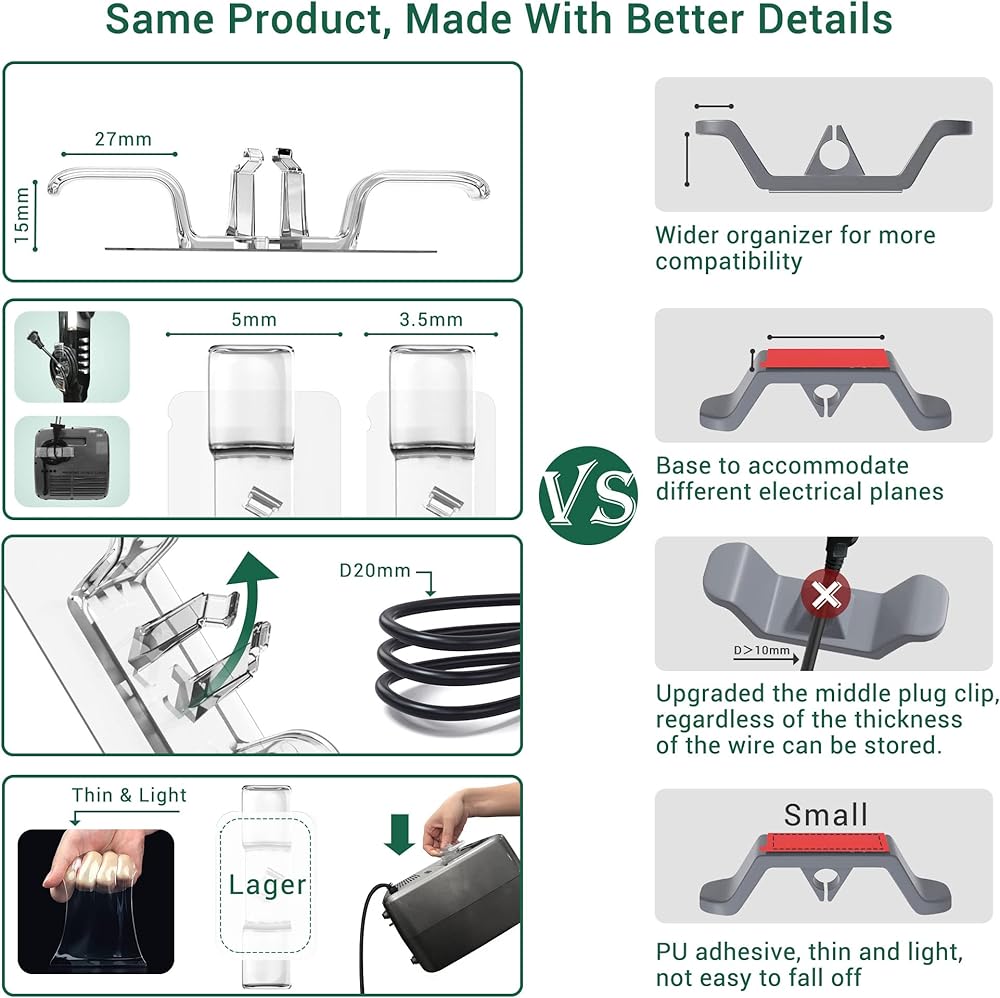 المزيد من التوافق: ① طول حامل سلك الجهاز هذا 3.3 سم على جانب واحد (الجانب الآخر 2.0 سم)، يعمل بشكل جيد مع الأسلاك الكبيرة والأطول. ② تم تصميم مقاسين من القاعدة لاستيعاب المستويات الكهربائية المختلفة (يمكن للأعرض استيعاب الأسطح ذات الانحناء الدقيق). ③ توسيع وتعميق مشبك القابس الأوسط، والذي يمكن تخزينه بغض النظر عن سمك القابس.
