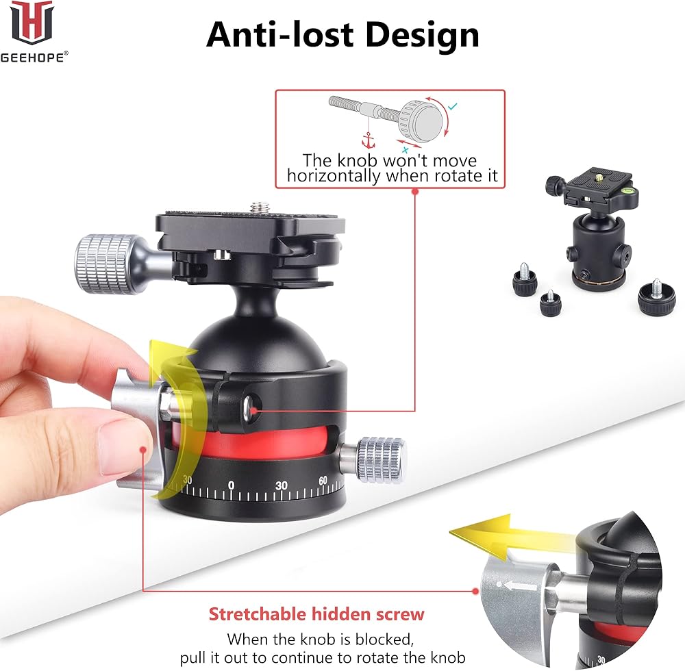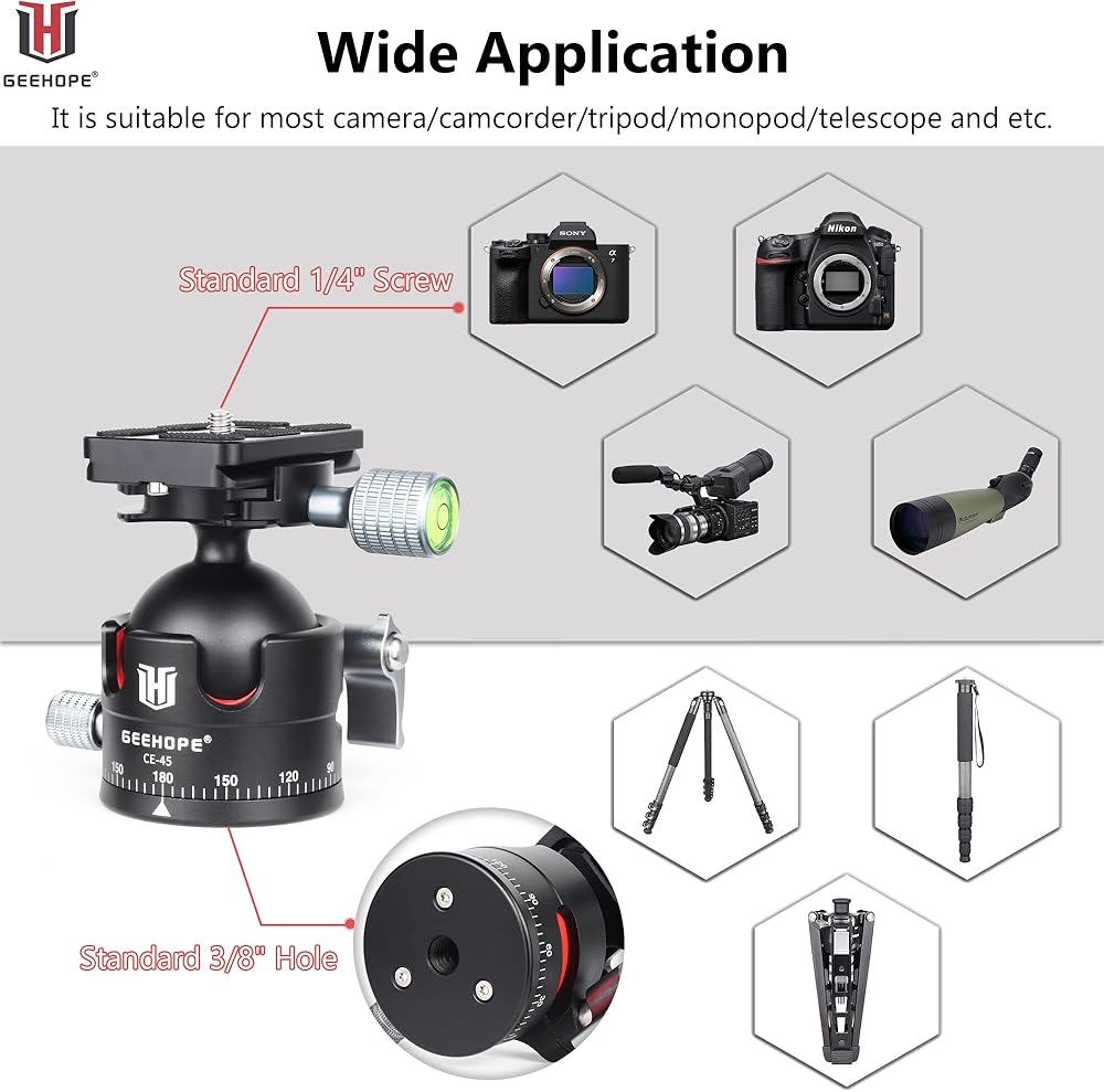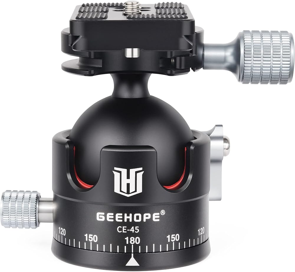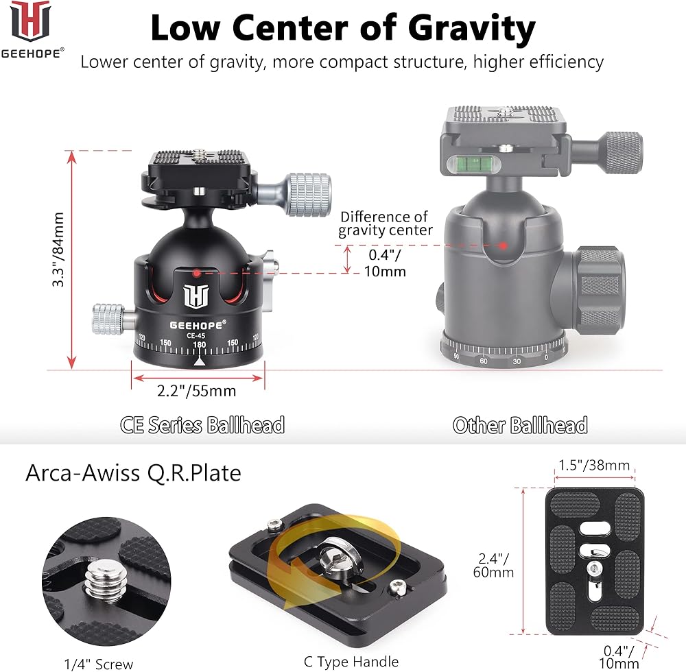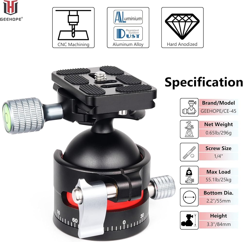 راس كروي ثلاثي القوائم من جيهوب CE-45 براس كروي معدني بانورامي عالمي 360 درجة لكاميرا دي اس ال ار ثلاثي القوائم احادي القوائم مع لوحة اركا سويس QR 45 ملم كرة كبيرة 1/4 انش تحميل برغي 55 باوند/25 كغم