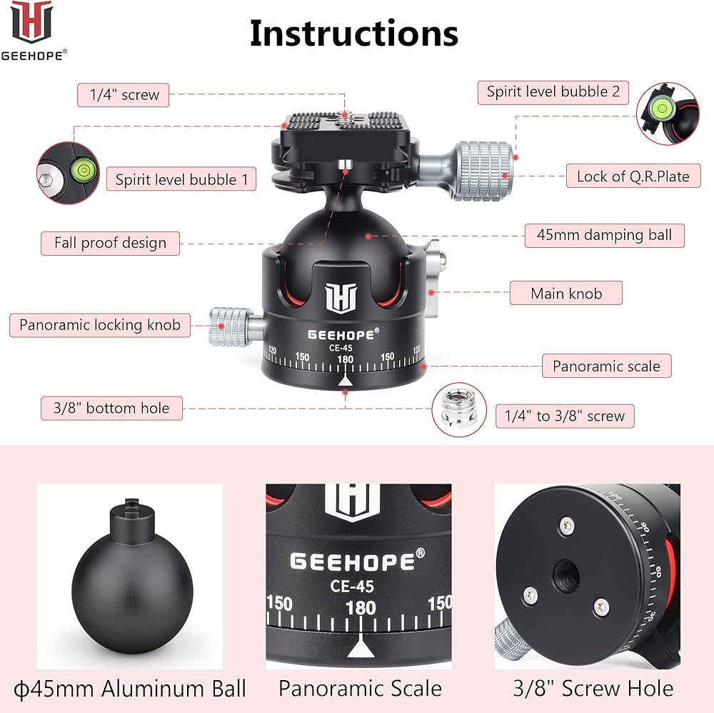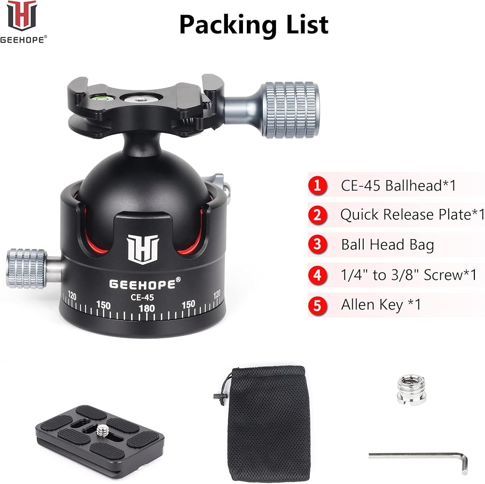 🔶الضمان والعبوة👍 ضمان لمدة عامين لمنتجاتنا. يوجد رأس كروي CE-45 وحقيبة رأس كروية وبرغي 1/4 انش إلى 3/8 انش ومفتاح الين في العبوة.