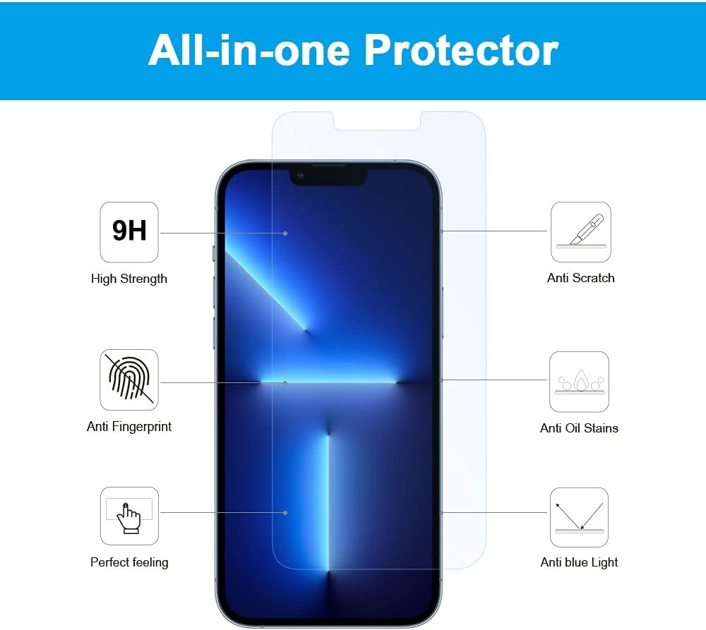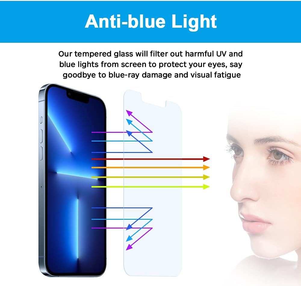 فلتر الضوء الأزرق: يتميز بتقنية ترشيح الضوء الأزرق، مما يزيل الضوء الأزرق لشاشة هاتفك للمساعدة في تخفيف عينيك من الإجهاد والتعب. يحافظ على صحة عينيك من التحديق في الشاشة لفترات طويلة من الوقت.