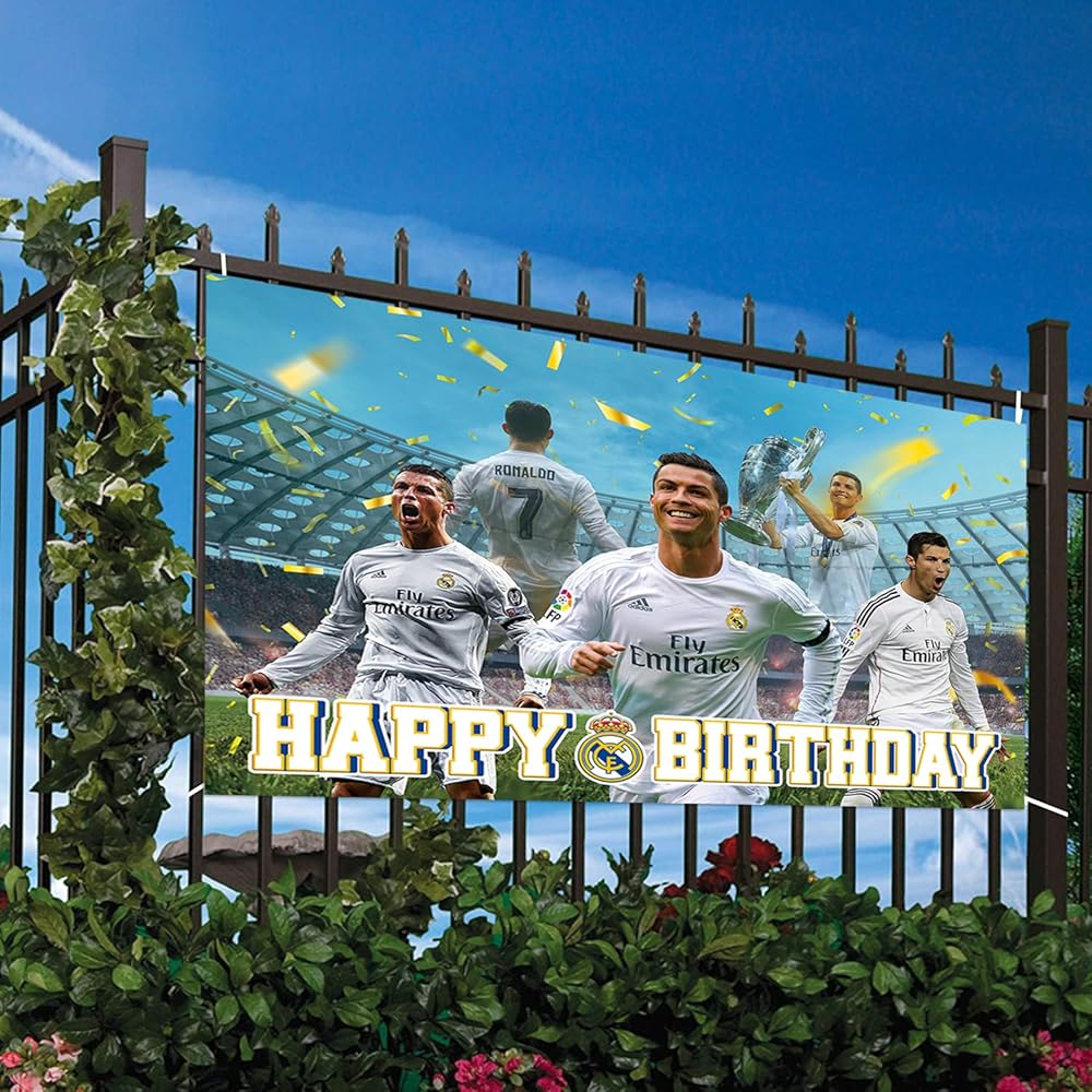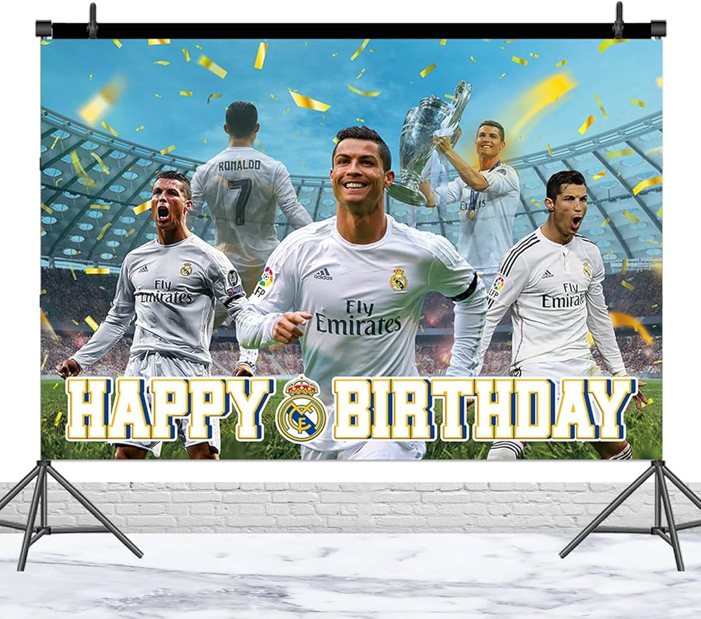 خلفية حفلة ريال مدريد: خلفية حفلة عيد ميلاد كرة القدم مطبوعة بملعب كرة القدم ولاعبي كرة القدم وحروف "Happy birthday" على السطح، مناسبة للحفلات ذات الطابع الخاص، والتي يمكن أن تكون حديث الحفلة كخلفية جميلة لديكوراتك ذات الطابع الخاص.