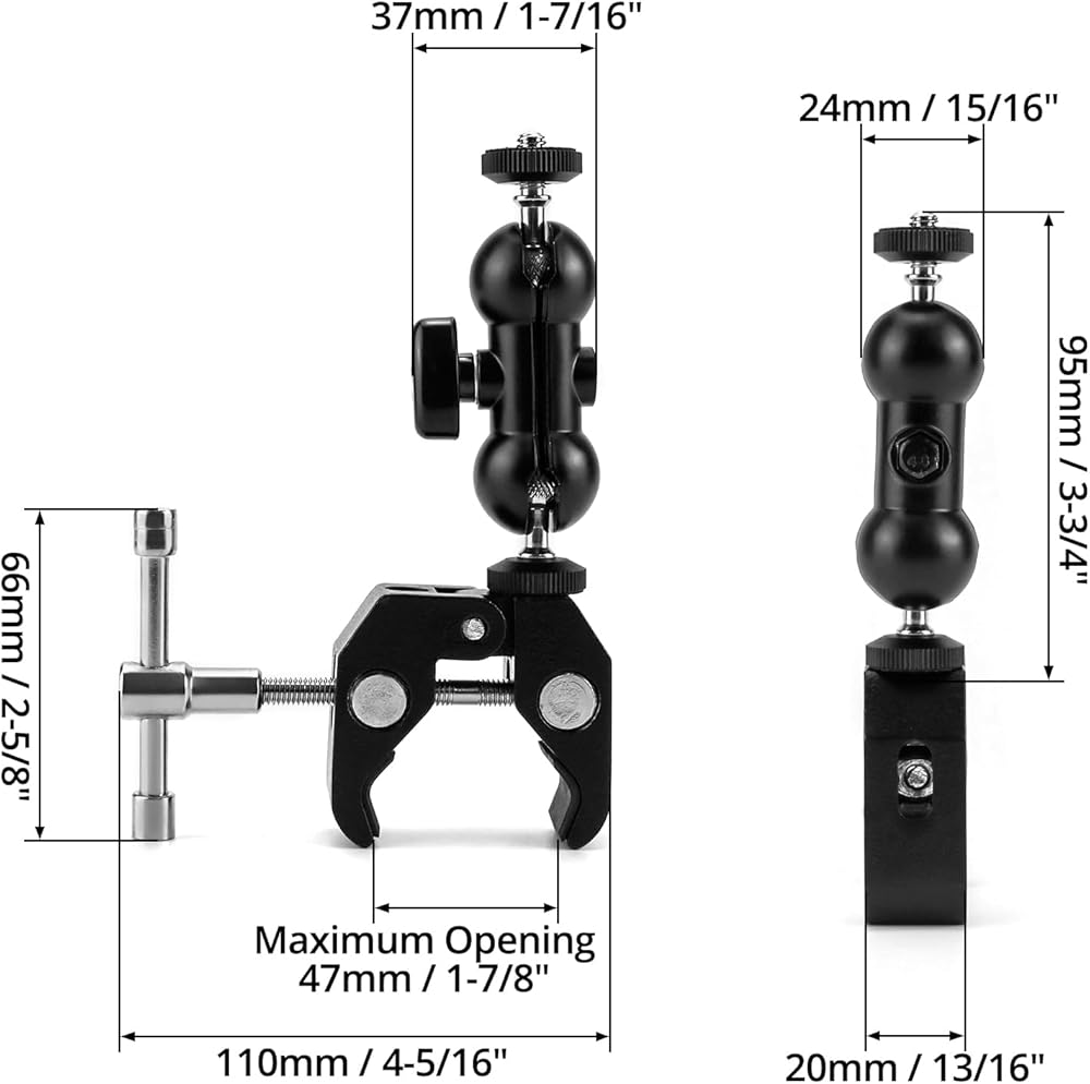• استخدامات متعددة: يحتوي المشبك الفائق على فتحة ملولبة 1/4 وفتحة ملولبة 3/8، والتي يمكنها تركيب الشاشة/كاميرا الحركة الصغيرة/إضاءة LED/الميكروفون/الفلاش؛ ثم يمكنك تثبيته في أي مكان تريده، مثل كاميرات DSLR والأعمدة والأضواء والخطافات والأرفف والقضبان المتقاطعة والمزيد.