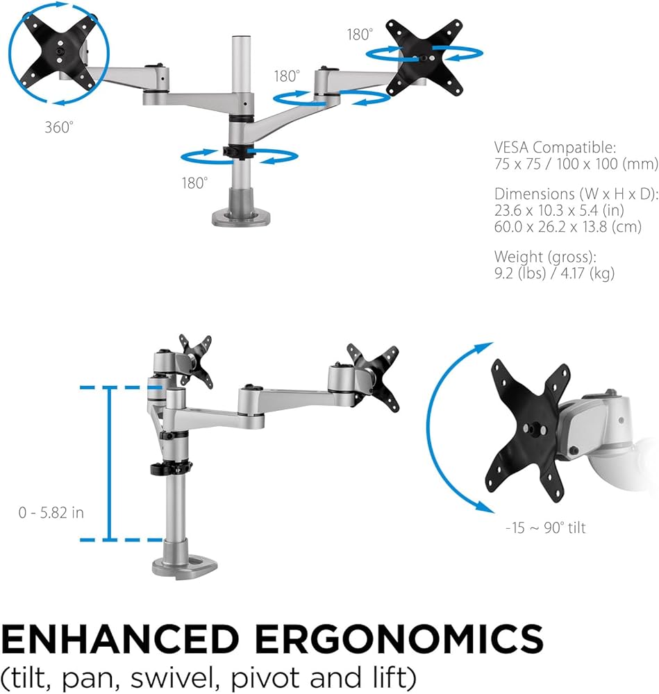 قم بإمالة الشاشات وتحريكها وتدويرها وتدويرها ورفعها إلى اتجاهات عمودية وأفقية وهجينة لتوفير الراحة المخصصة ووضعية العمل