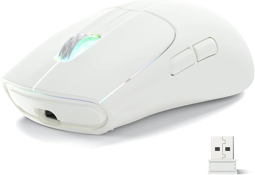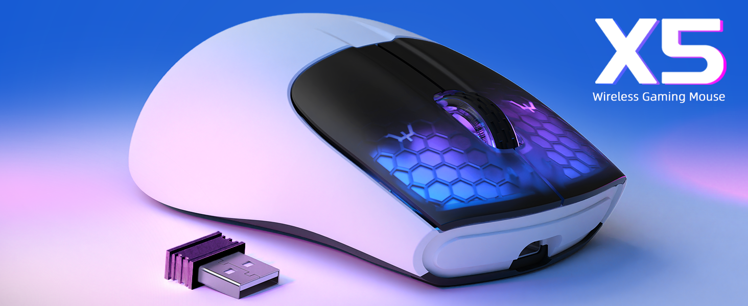 • إضاءة خلفية بألوان قوس قزح RGB ونوم تلقائي ذكي: تحتوي ماوس الألعاب X5 على حافظة شفافة على شكل قرص العسل للأزرار اليسرى واليمنى، وتوفر عرضًا مثاليًا لإضاءة RGB الزاهية التي تبلغ 16.8 مليون لون. يمكنك بسهولة تشغيل/إيقاف الضوء بالضغط مع الاستمرار زر عجلة التمرير لمدة 3 ثوان. يحمي النوم الذكي البطارية ويطيل وقت الاستخدام، حتى 200 ساعة من الاستخدام (إطفاء الأنوار)، وسيدخل في وضع السكون بعد دقيقتين للحفاظ على الطاقة ويمكن إيقاظه بالضغط على أي زر.