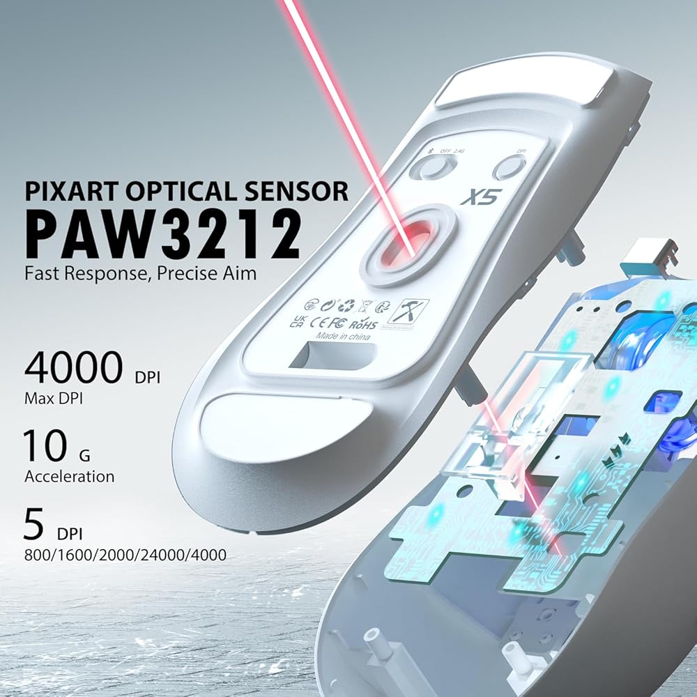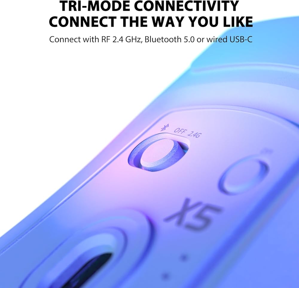 • اتصال ثلاثي الأوضاع: بالمقارنة مع الفئران السلكية، يوفر الماوس اللاسلكي X5 ثلاثة أوضاع اتصال مختلفة، USB-C سلكي، ووضع لاسلكي 2.4 جيجا هرتز ووضع بلوتوث، والتي يمكن التبديل بينها بسرعة عبر زر في الجزء السفلي من الماوس. تبلغ مسافة الإرسال في الوضع اللاسلكي Bluetooth و2.4 جيجا هرتز حوالي 33 قدمًا. كما أنها تعتمد مستشعر Pixart 3212 البصري الذي يصل تردد الإرسال إلى 2480 ميجا هرتز ومعدل تحديث يصل إلى 4000 إطارًا في الثانية.