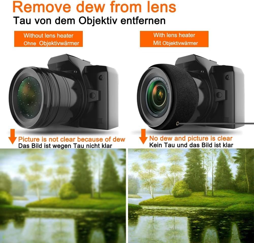 🎁 تسخين العدسة: يحمي عدسة الكاميرا أو التلسكوب الخاص بك قبل التجمد والضباب. مثالية لالتقاط الصور أثناء الليل أو الصباح في مكان ذي رطوبة عالية.