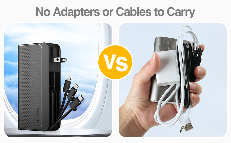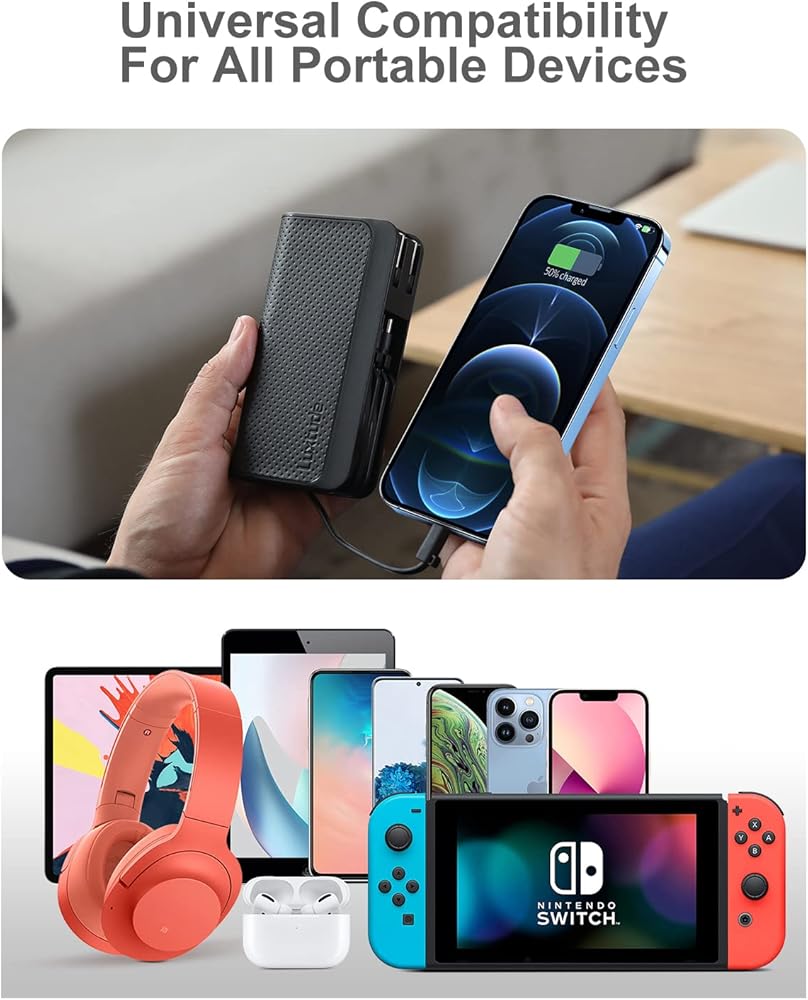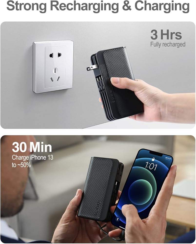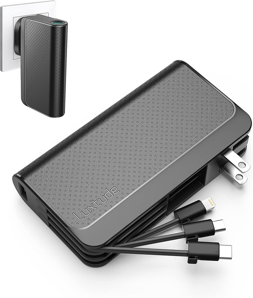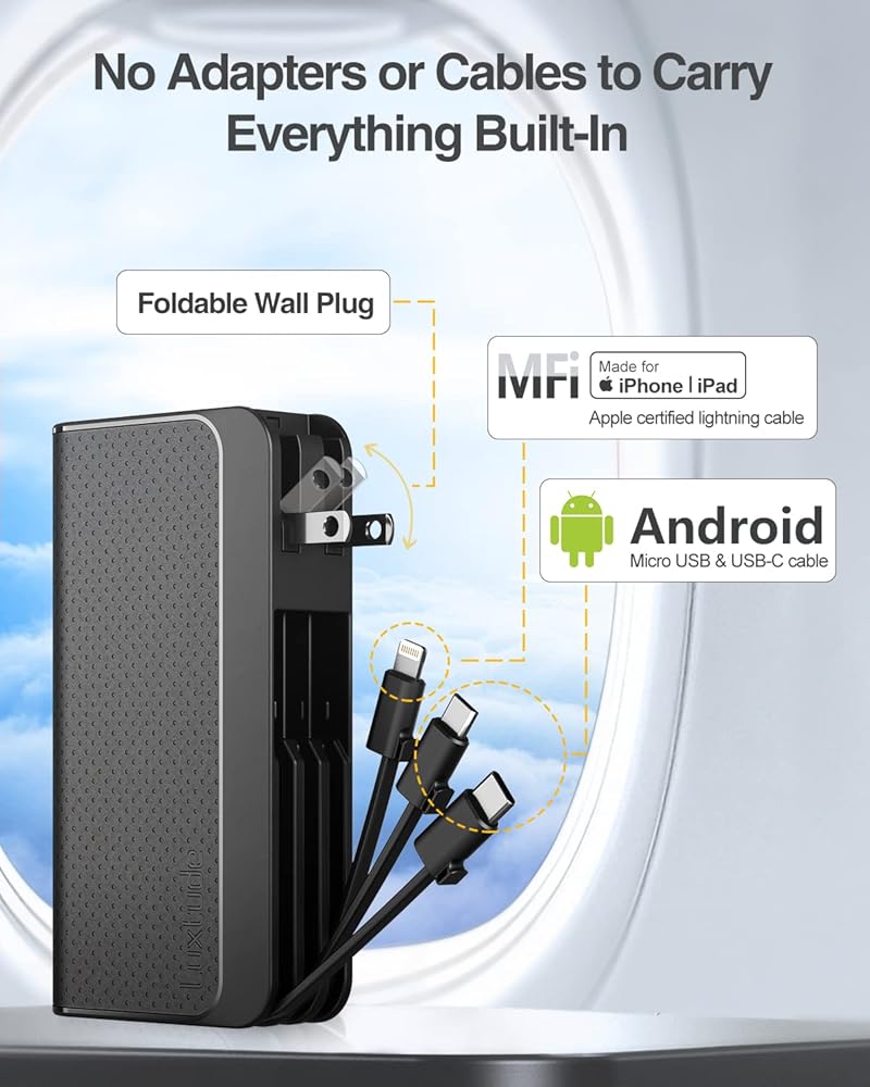 【بنك طاقة الكل في واحد】: الشاحن المحمول Luxtude "الكل في واحد" مدمج مع كابل MFi Lightning لأجهزة iPhone، وكابل USB C لهاتف iPhone 15 وSamsung Galaxy وما إلى ذلك، وكابل صغير لهواتف Android الأخرى متوافق عالميًا مع جميع أجهزتك المحمولة، ولا يوجد أي كابلات لحملها أو فقدانها.