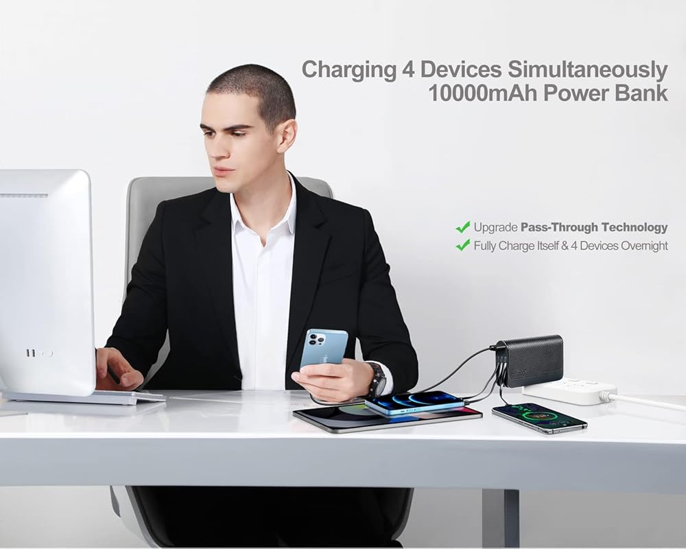 【طاقة كبيرة وشحن سريع】: يوفر شاحن الهاتف المحمول عالي السعة 10000 مللي أمبير في الساعة حوالي 1.1 شحن لهاتف iPhone 13، و2.1 شحن لجهاز Galaxy S9، و2.4 شحن لهاتف iPhone12 (5 فولت/3.1 أمبير مشترك). ومع تقنية المرور الخاصة بنا، يمكنك شحن 4 أجهزة وبنك طاقة في وقت واحد.