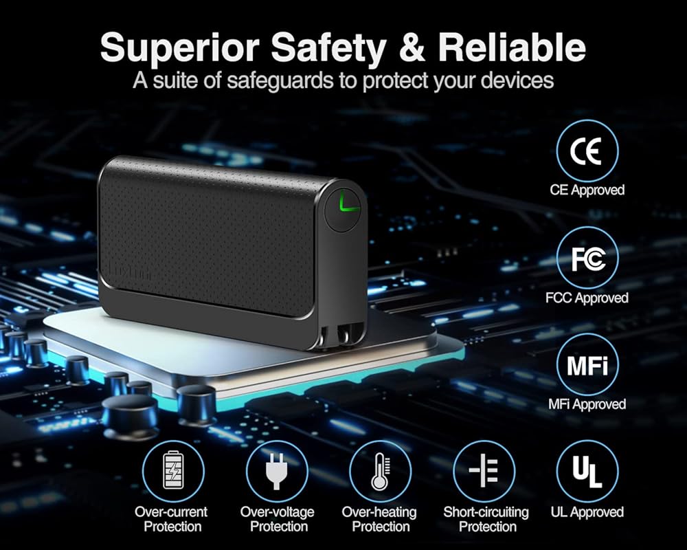 【حماية السلامة】: 1. بطارية ليثيوم ممتازة معتمدة من UL لضمان الشحن الآمن؛ 2. إدارة الطاقة الذكية IC توفر حماية ماس كهربائى للطاقة، والتيار الزائد، والجهد الزائد، وحماية الحرارة الزائدة؛ 3. التشغيل/الإيقاف التلقائي - سيتم تشغيله تلقائيًا عند توصيل الهاتف، وإيقافه تلقائيًا (خلال دقيقة واحدة) عندما يكون هاتفك مشحونًا بالكامل أو عند عدم توصيل أي جهاز.