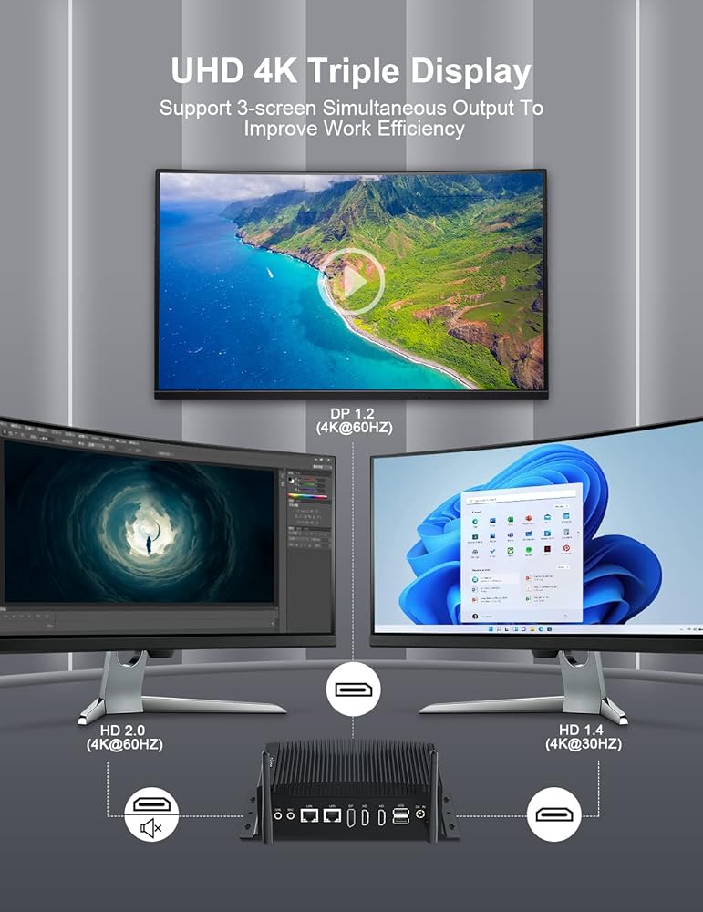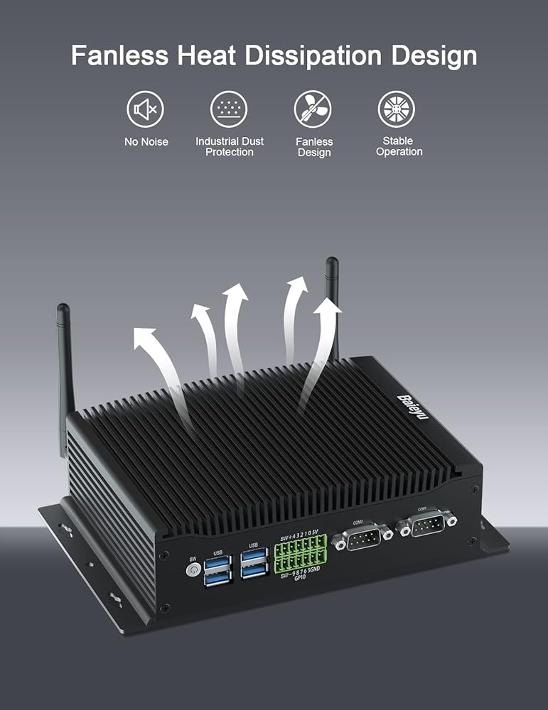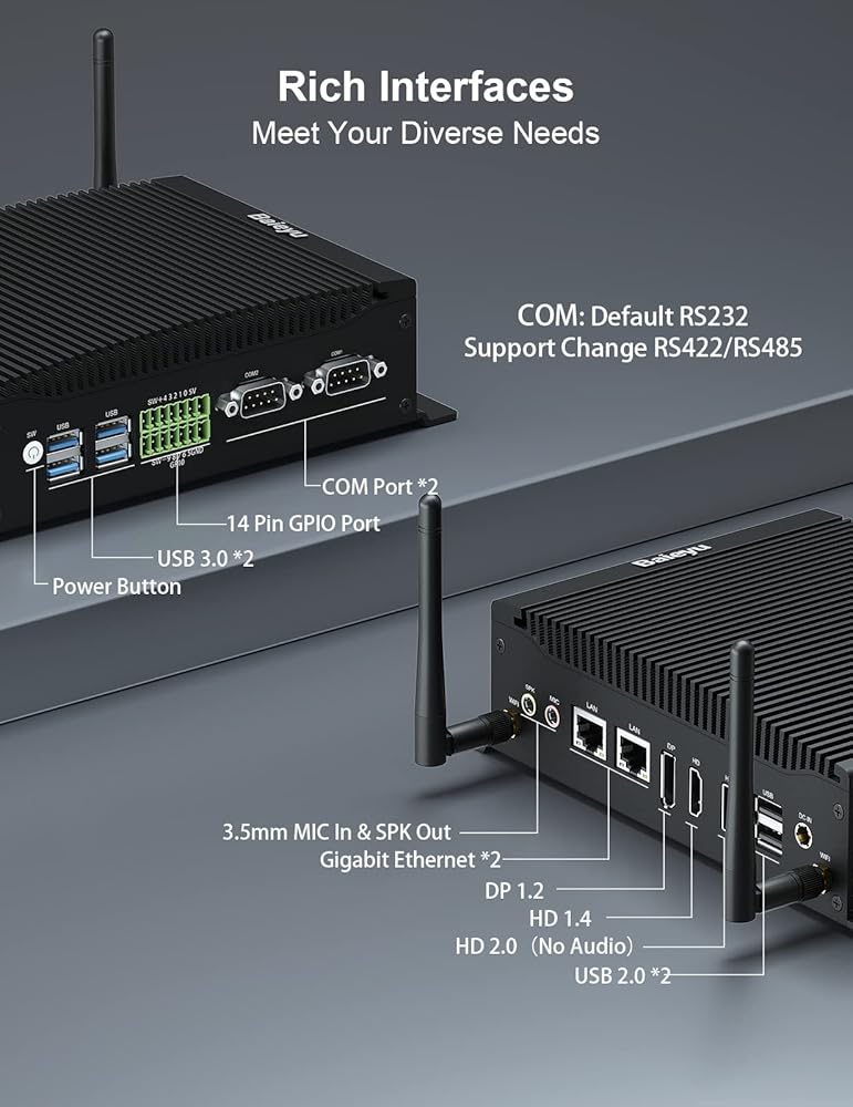 🌟 【تصميم ووظيفة فريدة من نوعها 】جهاز كمبيوتر برجي صغير مزود بحامل VESA، يمكنك ربط جهاز الكمبيوتر الخاص بك خلف الشاشة وتحويله إلى جهاز الكل في واحد زائف. يسمح التصميم بدون مروحة بالاستمتاع بدون ضوضاء. يعتمد إطارها على تصميم موجة الحزام، مما يؤدي إلى توسيع سطح تبديد الحرارة. يدعم الكمبيوتر المكتبي الصغير بدون مروحة Wake-On-LAN، وPXE-Start، والتشغيل التلقائي. يحتوي الكمبيوتر الصغير أيضًا على منافذ جيجابت إيثرنت مزدوجة، لذلك يمكن لهذا الكمبيوتر دعم وظيفة جدار الحماية.