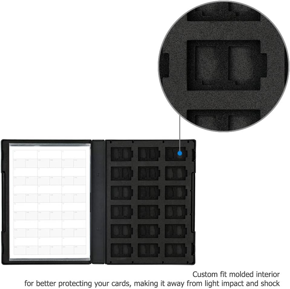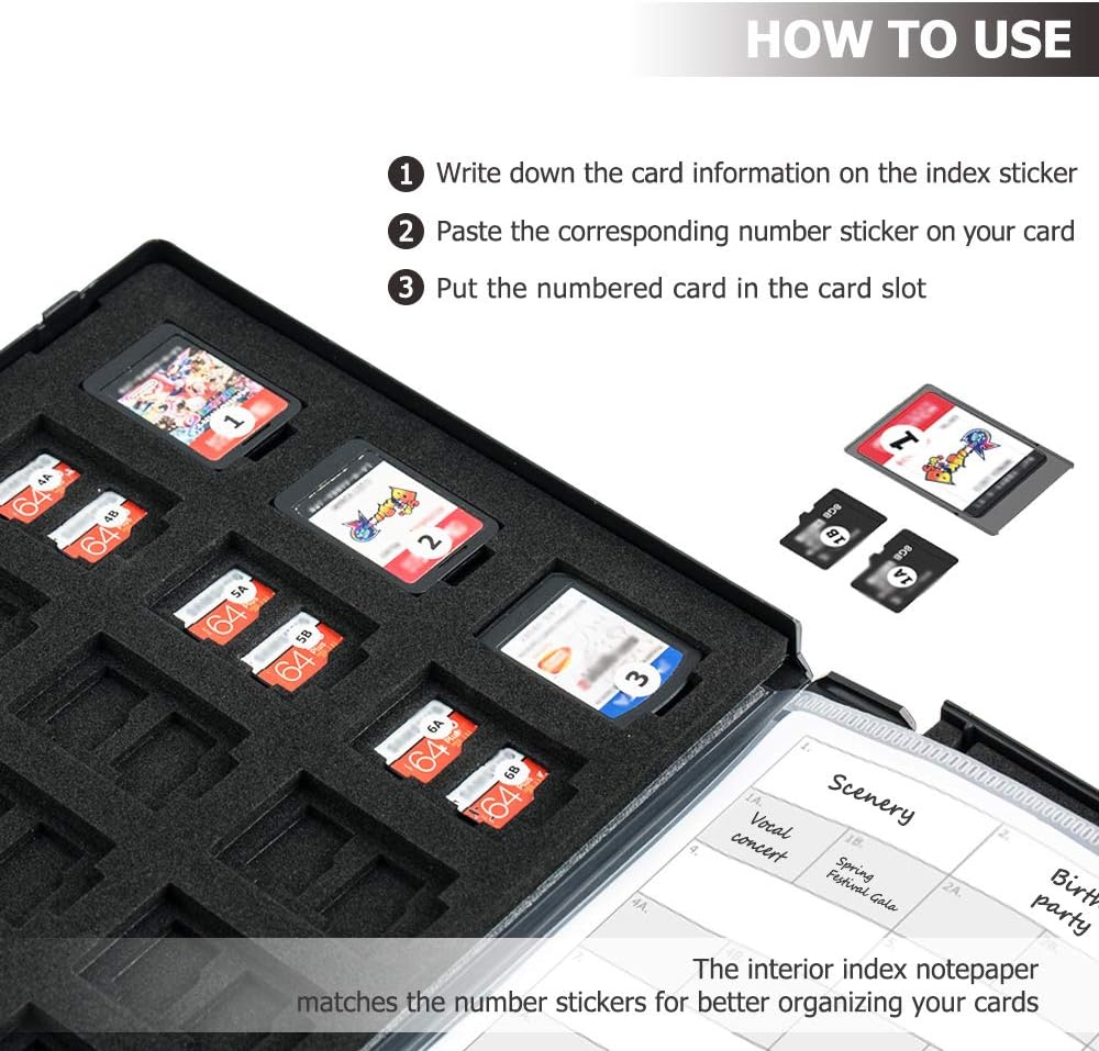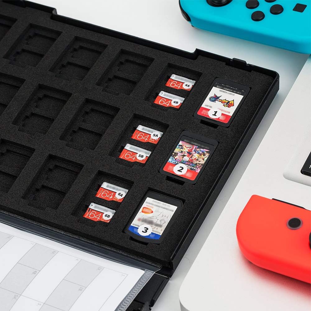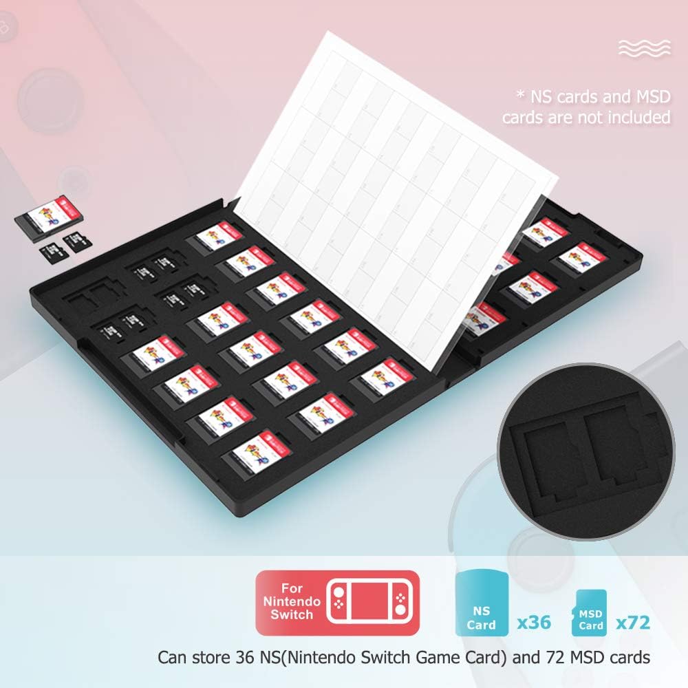سعة التخزين: مخزن 36 NS (بطاقة ألعاب نينتندو سويتش) و72 بطاقة MSD/Micro SD/Micro SDHC/Micro SDXC/TF. الحجم 7.4*5.4*0.8 بوصة، نفس حجم علبة DVD.