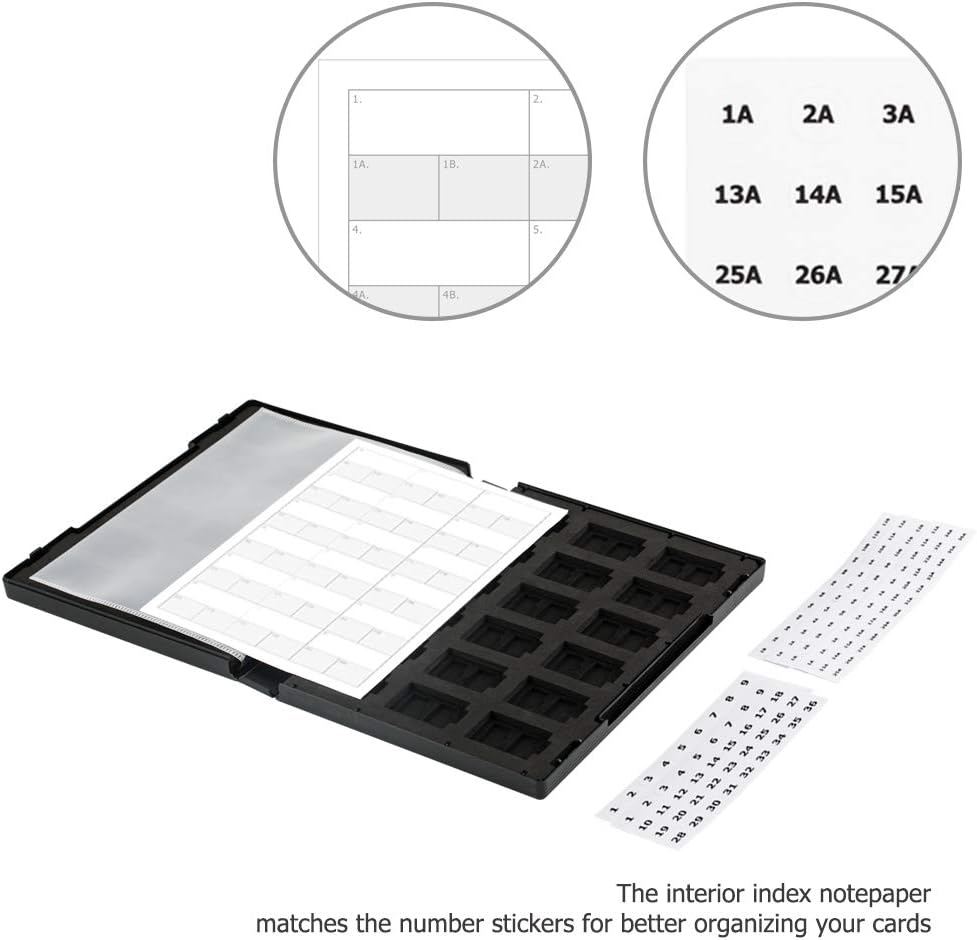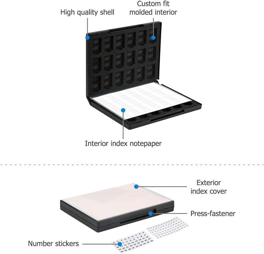 إن حافظة البطاقات ذات الـ 108 فتحة هذه عبارة عن جهاز تخزين أرشيفي بحجم علبة DVD. يتيح لك غطاء الفهرس الخارجي العثور عليه بسهولة على رف الكتب الخاص بك. حافظة البطاقات مصنوعة من مادة البولي بروبيلين وتحتوي على ورقة فهرس من الخارج وأغطية من الداخل لتتمكن من تنظيم البطاقات بشكل أفضل.