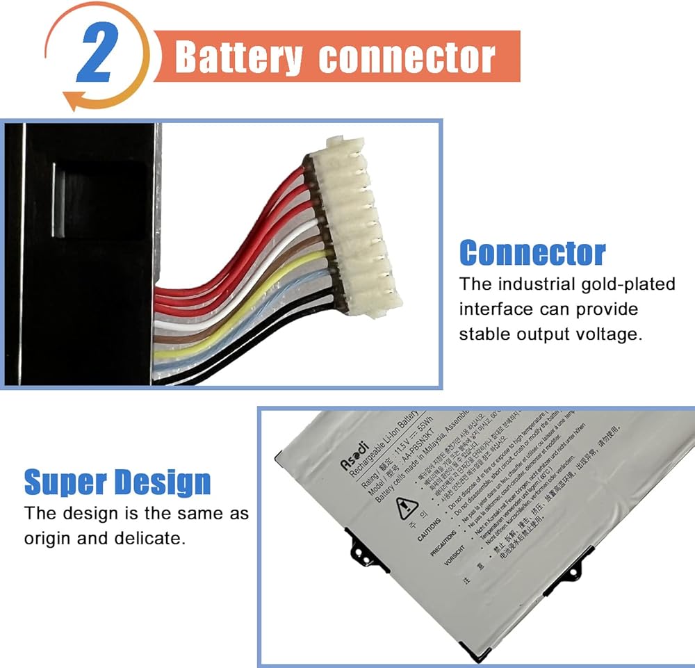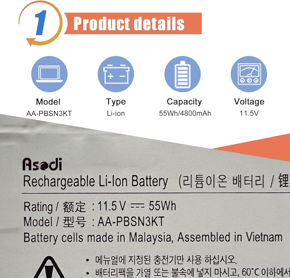 <1> الموديل: AA-PBSN3KT. الجهد: 11.5 فولت . السعة: 55 وات/4800 مللي أمبير 3 خلايا. اللون الابيض . علامة تجارية جديدة بنسبة 100%. (يُرجى فتح الجراب الخلفي لجهاز الكمبيوتر المحمول الخاص بك والتحقق من رقم الجزء الدقيق للبطارية الأصلية لجهاز الكمبيوتر المحمول الخاص بك قبل تقديم طلبك)