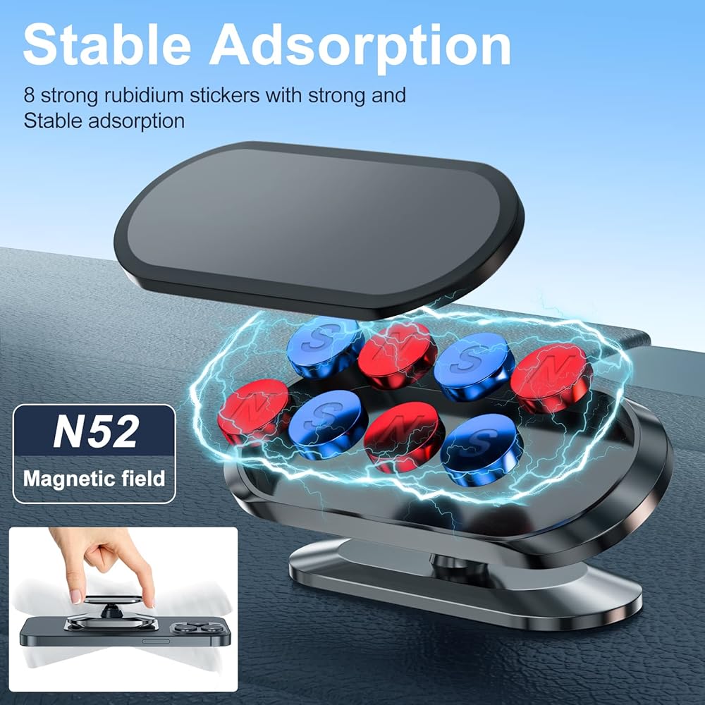 • مغناطيس قوي: تم تجهيز حامل الهاتف المغناطيسي للسيارة هذا بـ 8 مغناطيسات N52، والتي يمكن أن تولد جاذبية مغناطيسية قوية وتمسك جهازك بإحكام، بغض النظر عن ظروف الطريق. يسمح لك حامل الهاتف المغناطيسي هذا بالقيادة دون القلق من سقوط جهازك.