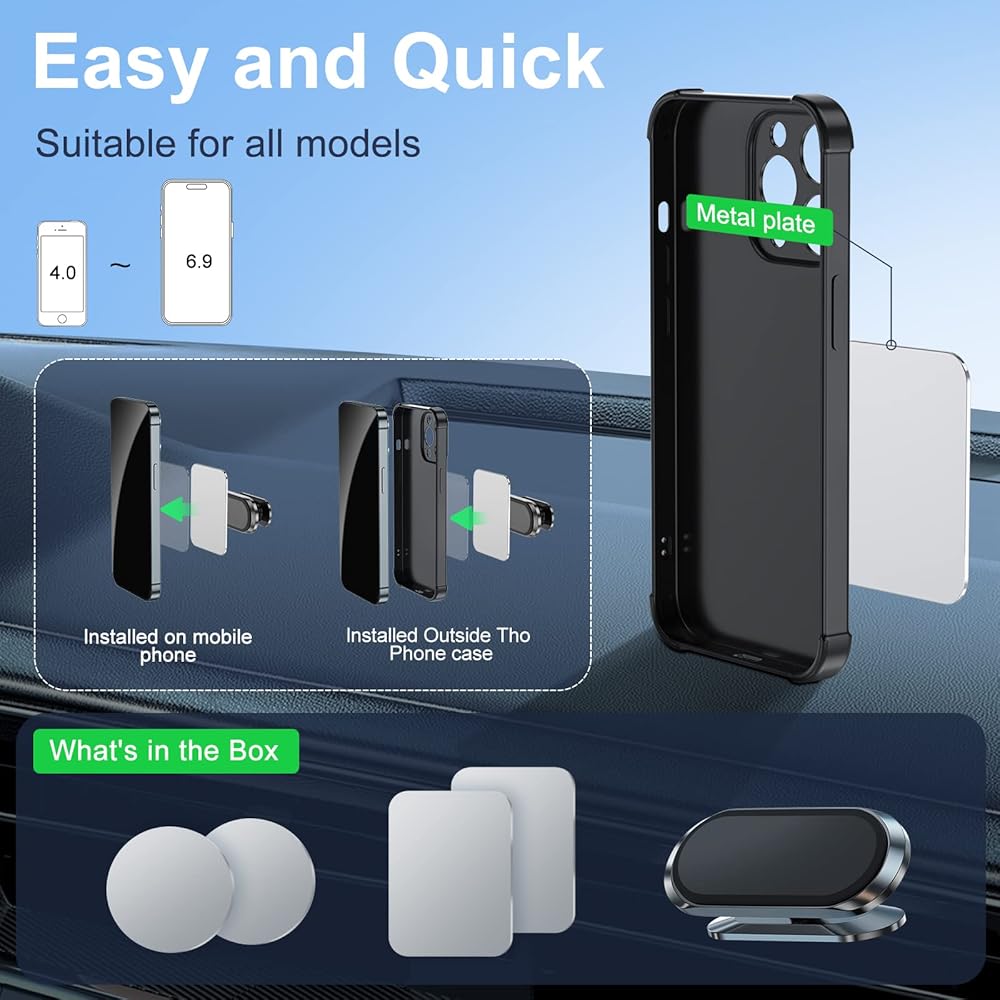 • توافق عالمي: حامل الهاتف المغناطيسي هذا متوافق مع جميع الهواتف الذكية، حتى تلك ذات الحافظات السميكة. يتضمن ذلك أجهزة مثل متوافقة مع ايفون 14 13/12، سامسونج جالكسي نوت 20/اس 20، جوجل، ال جي، وأكثر من 4 ~ 6.7 انش في جميع الهواتف. ملاحظة: غير متوفر لأجهزة ايباد.. تذكير مهم: يرجى الانتظار 12 ساعة بعد التثبيت قبل استخدام حامل الهاتف بالسيارة.