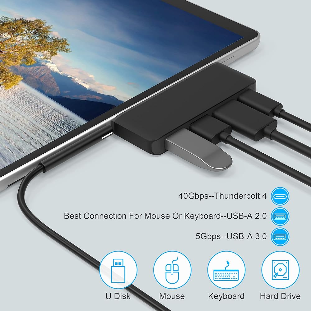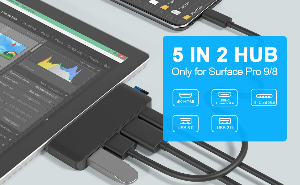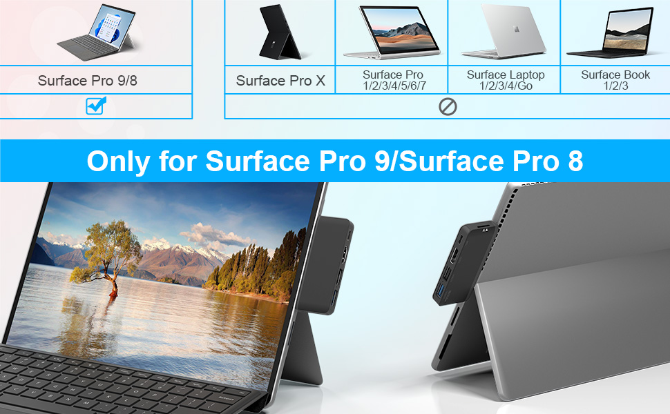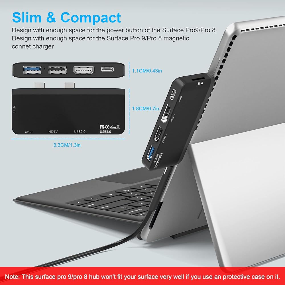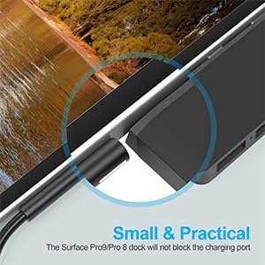 【موزع الكل في واحد لجهاز سيرفس برو 8/9】قاعدة شحن USB C 5 في 2 لجهاز مايكروسوفت سيرفس برو 9/8. قم بتحويل منفذي USB نوع C إلى 5 منافذ: 1 HDMI (4K 30Hz)، 1 USB C (الصوت + نقل البيانات + شحن PD)، 1 USB 3.0 و1 USB 2.0، 1 قارئ بطاقات TF (Micro SD). يعمل موزع سيرفس برو 9/8 على توسيع فرص عملك ويوفر لك أداءً أكثر استقرارًا. لا حاجة إلى أي برامج تشغيل أو برنامج، فقط قم بالتوصيل والتشغيل. ملاحظة: نوصي بعدم استخدام حافظة واقية عند استخدام قاعدة الشحن سيرفس برو 9/8.