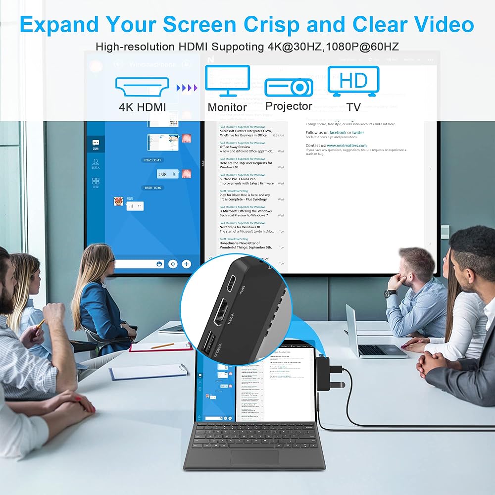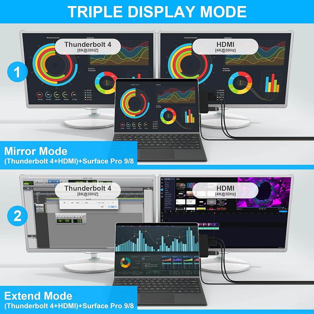 【شاشة مزدوجة بدقة 4 كيه وشاشة ثلاثية】يمكن لمحول سيرفس برو 9/8 بسهولة تحقيق شاشات مزدوجة وشاشة ثلاثية (UHD 4K HDMI + USB-C ثونربولت 4 + أوضاع سيرفس برو 9/8) لمايكروسوفت سيرفس برو 9 ومايكروسوفت سيرفس برو 8، باستخدام شاشات مختلفة للقيام بمشاريع مختلفة سيجعل عملك / حياتك أكثر كفاءة. يدعم موزع اتش دي ام اي دقة فيديو تصل إلى 4 كيه عند 30 هرتز، ويدعم دقة 2K/ 1080p/ 720p/ 480p/ 360p. يو اس بي نوع سي ثونربولت 4 بدقة تصل إلى 8 كيه عند 30 هرتز.