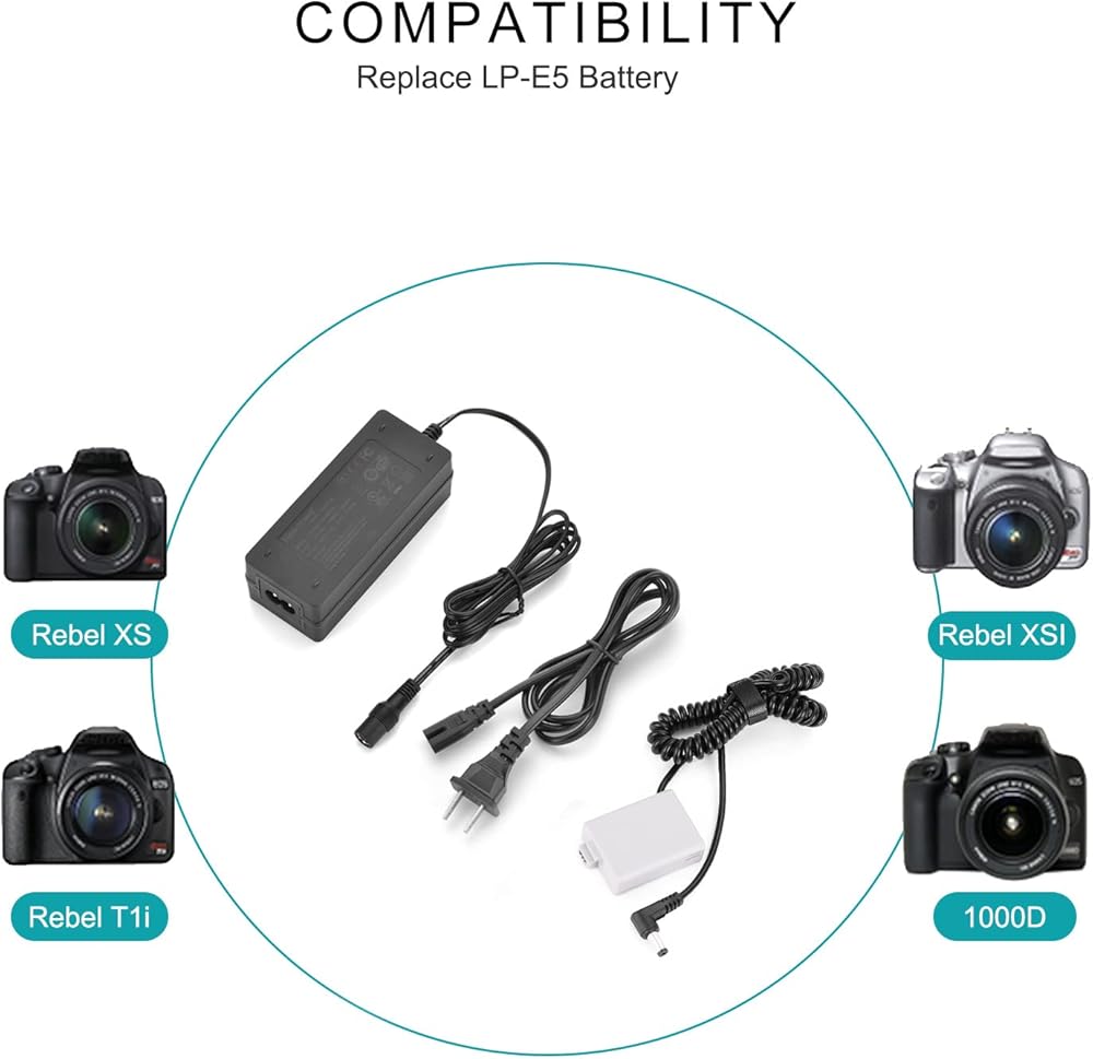 نيو موا LP-E5 محول إمداد طاقة تيار متردد بديل للبطارية ومجموعة شاحن مقرنة تيار مستمر لكاميرا كانون EOS Rebel XS,Rebel T1i,Rebel XSi,1000D,500D,450D,Kiss X3,Kiss X2,Kiss F